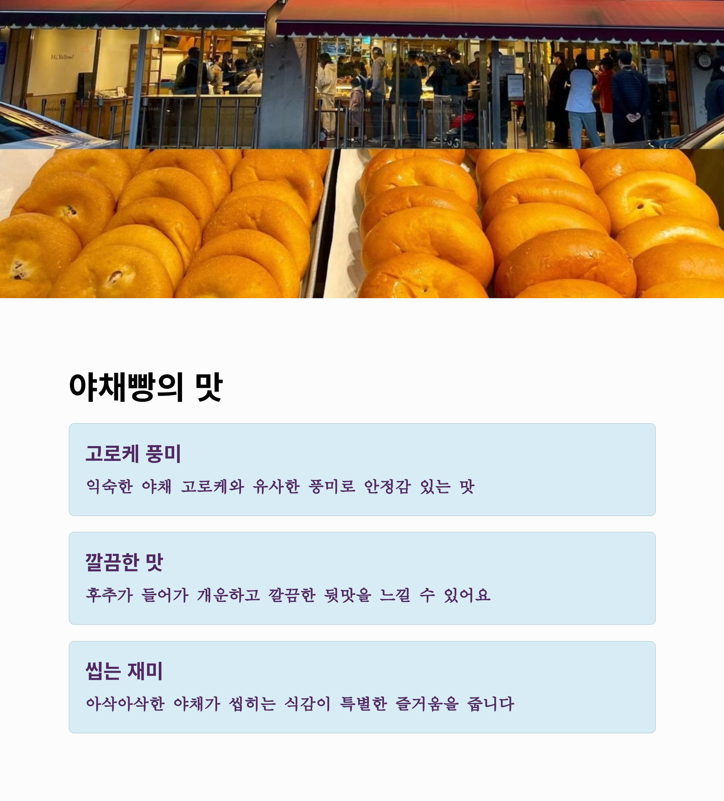 | 부드럽고 진한 팥 향 씹는 재미가 있는 쫀득함 | 기름기 없어 부담 없는 빵 채소 좋아하는 분들에게 인기 | 대중적인 맛 구성으로 누구나 쉽게 즐김 휴게소, 기차 간식으로도 인기 |