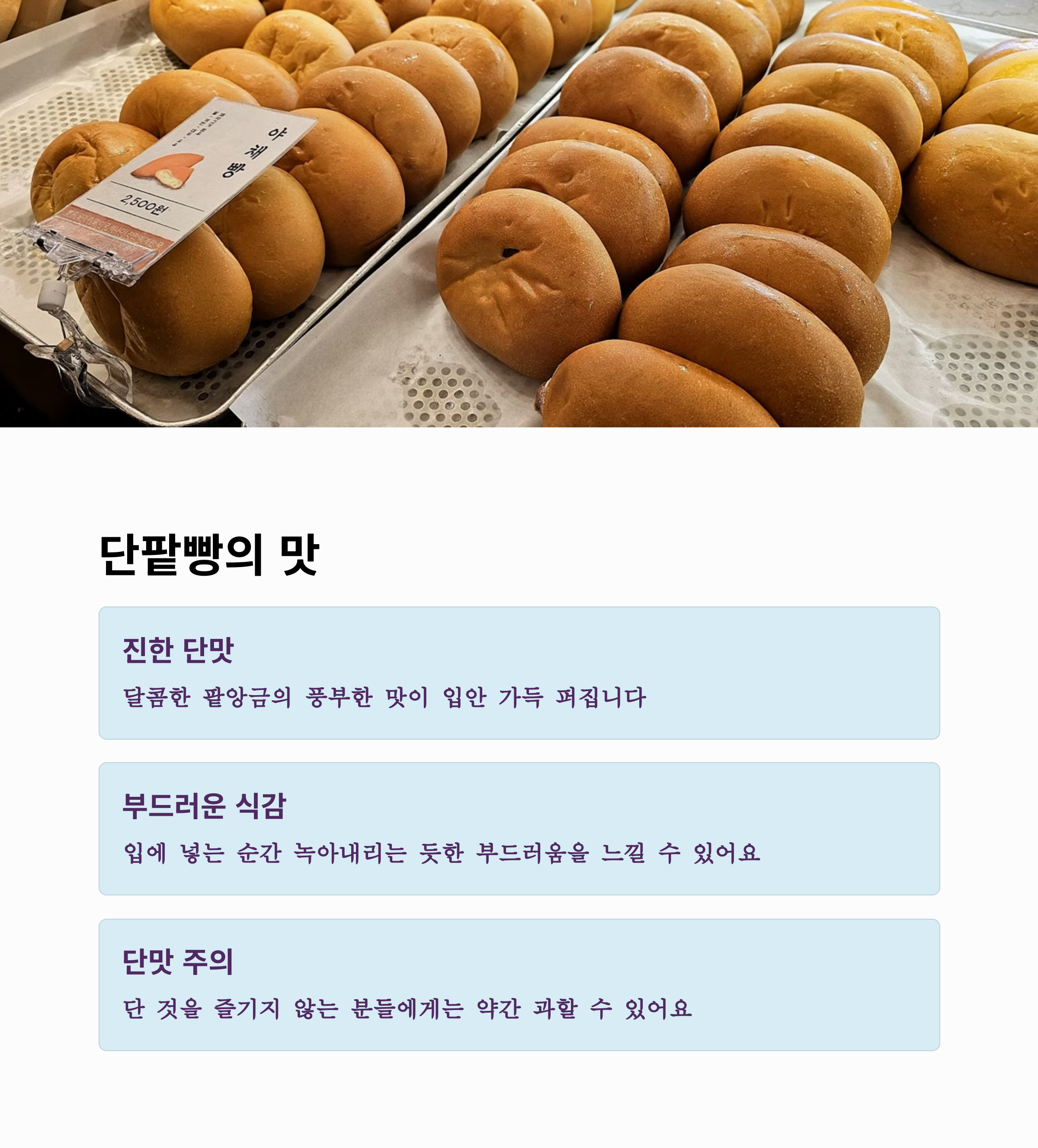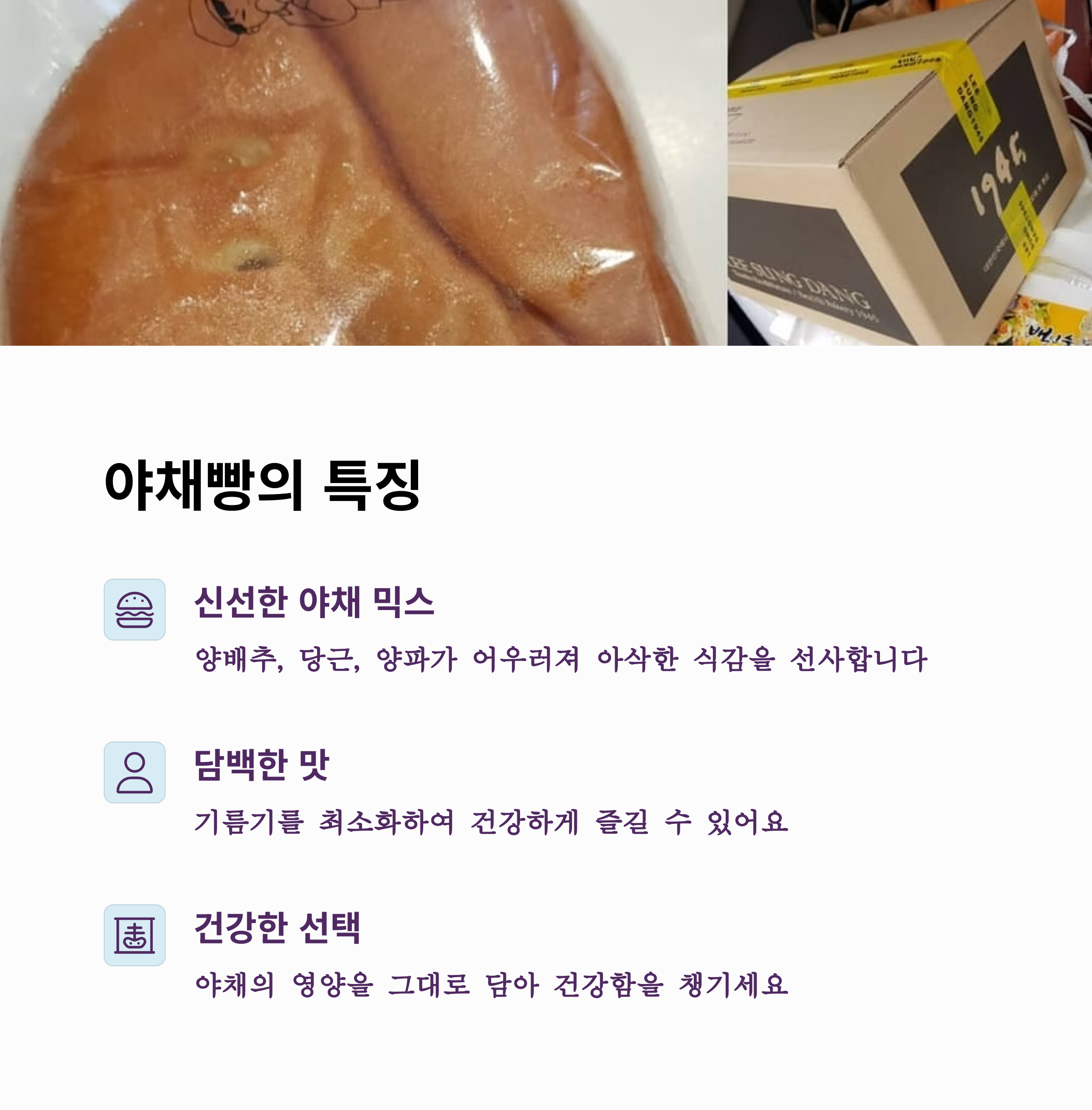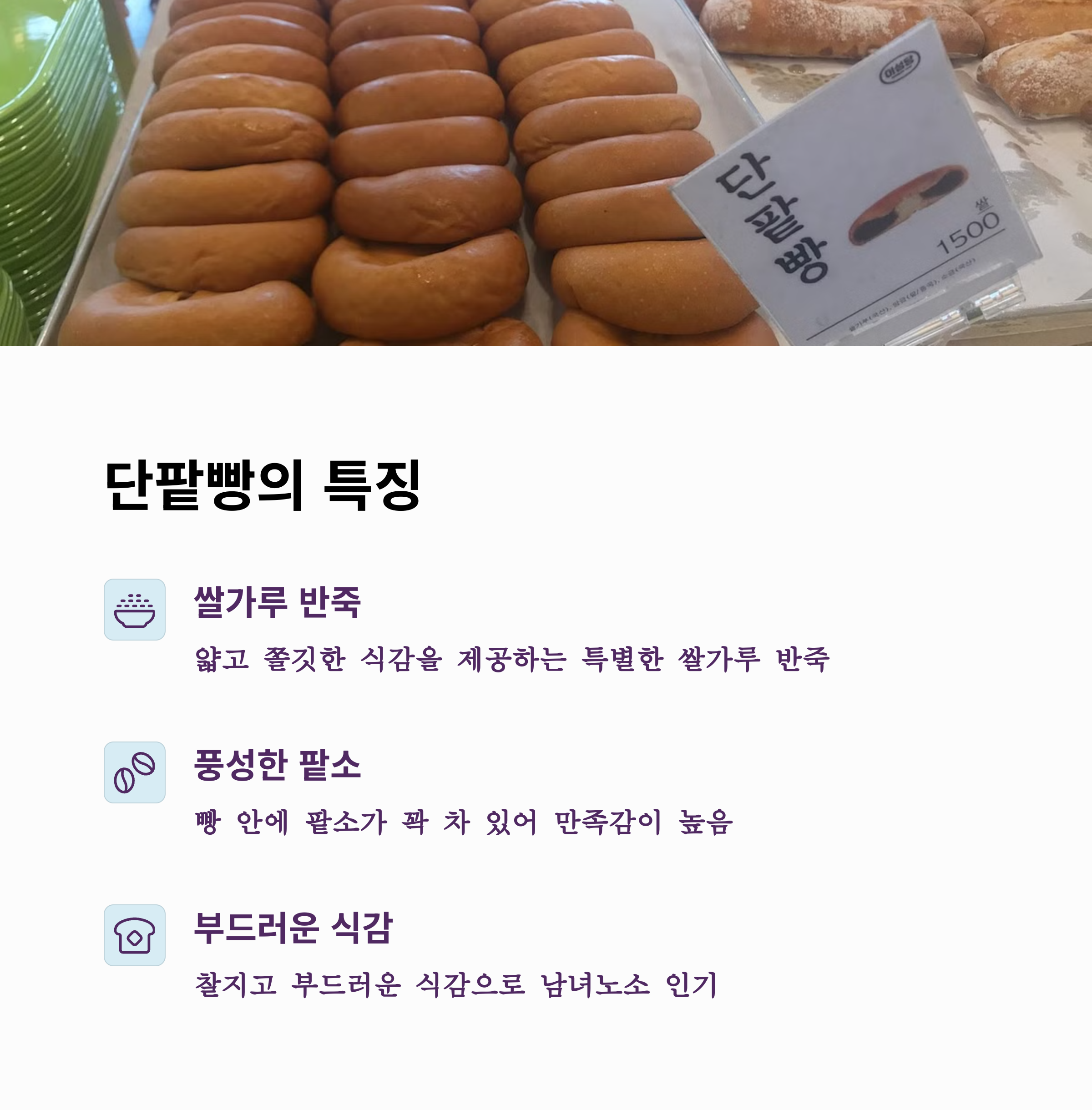 | 단팥빵 특징 | 야채빵 특징 | 공통 장점 |