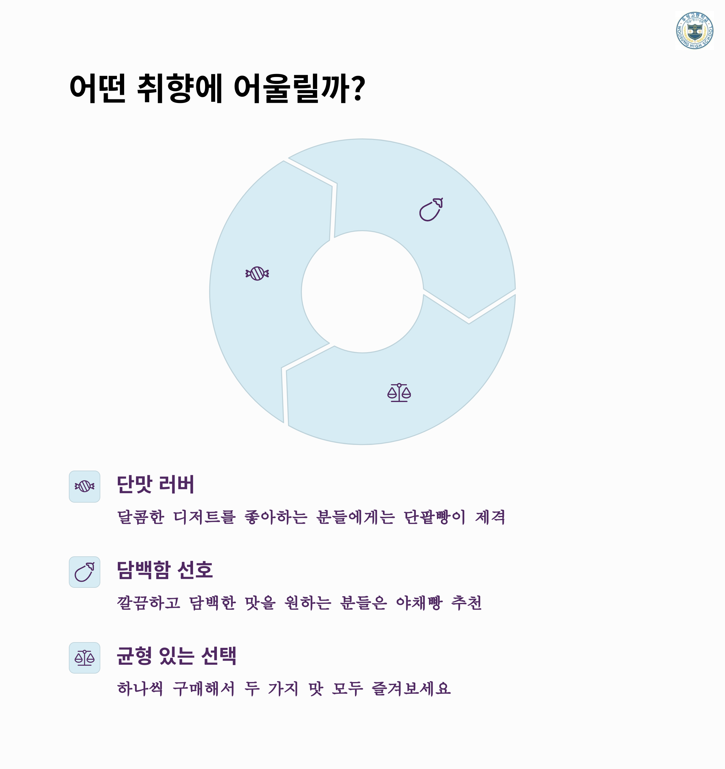 | 단팥빵 특징 | 야채빵 특징 | 공통 장점 |