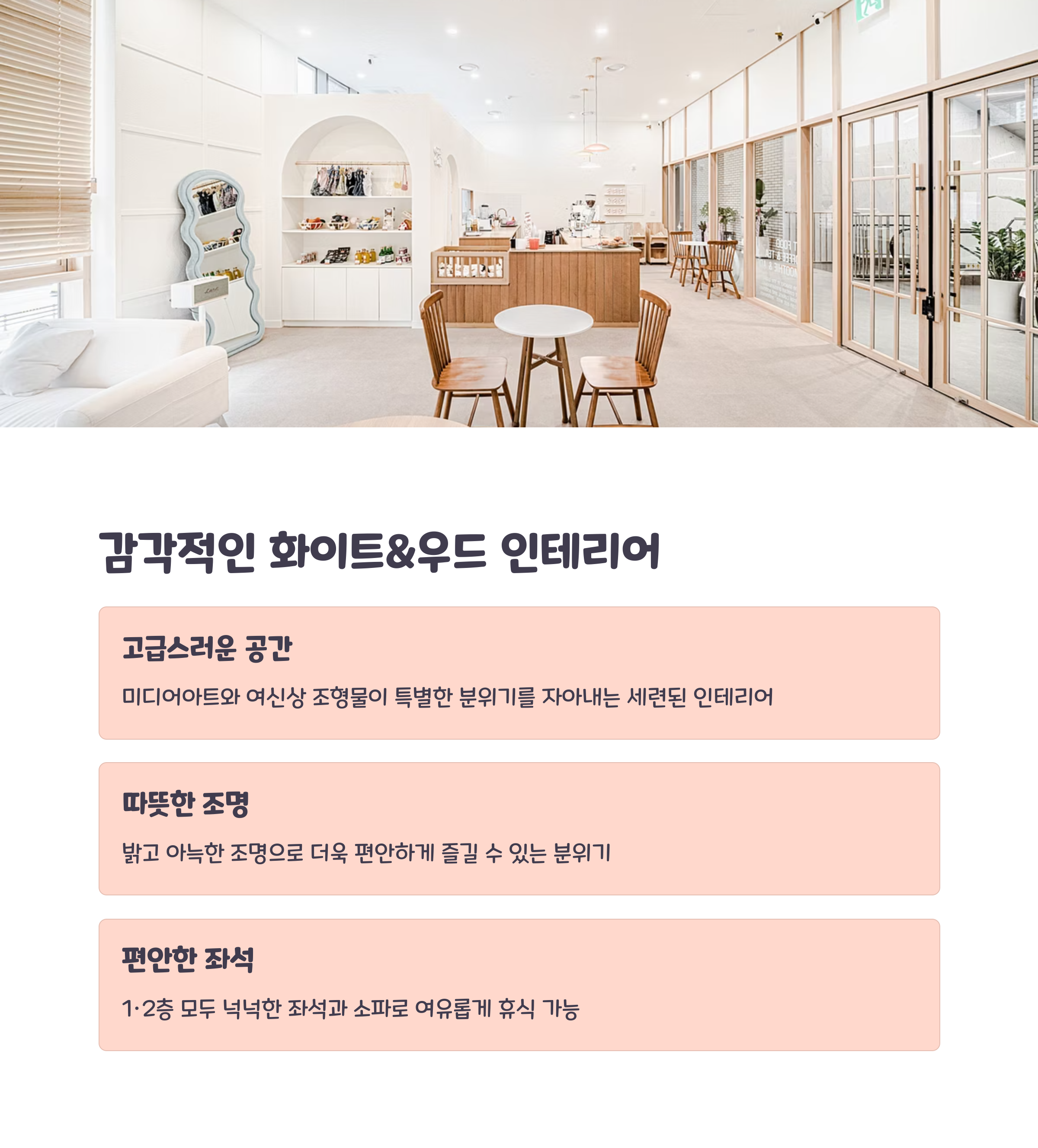 카페 라데아는 총 3층 규모의 브런치&디저트 카페로, 화이트와 우드톤 인테리어가 조화를 이루며 따뜻하고 세련된 분위기를 자아냅니다. 1층은 베이커리와 음료 바, 2층은 뷰 좋은 창가 좌석과 포토존이 많아 데이트에 제격이고, 3층 루프탑은 야외 테라스 감성을 느낄 수 있어 날씨 좋은 날엔 특히 인기가 많습니다.