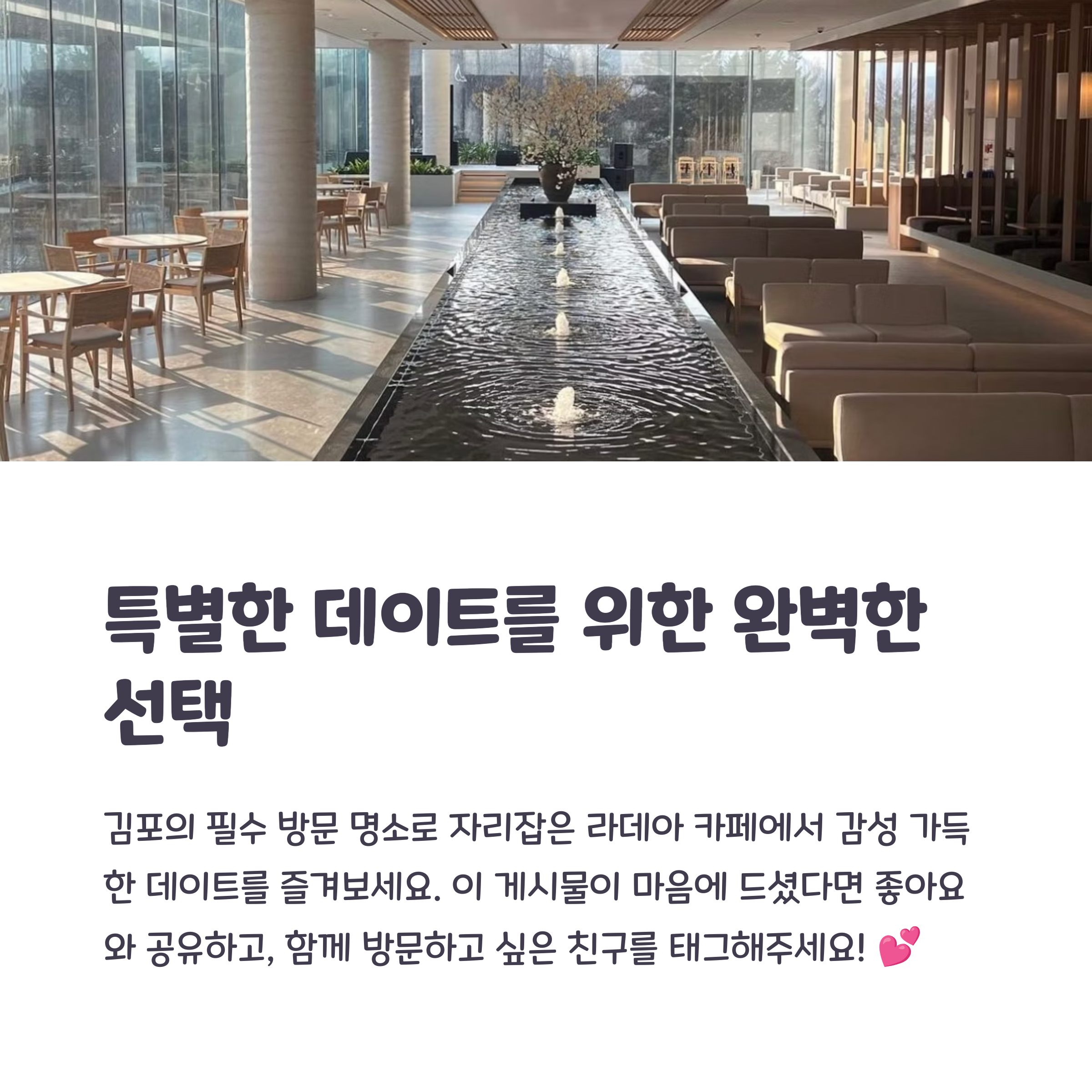감성 인테리어, 브런치, 여유로운 뷰가 함께하는 김포 카페 라데아는 힐링이 필요한 연인들의 데이트 코스로 강력 추천됩니다. 주말 나들이, 소소한 기념일, 일상 속 특별함을 원할 때 라데아에서 여유로운 시간을 보내보세요.
