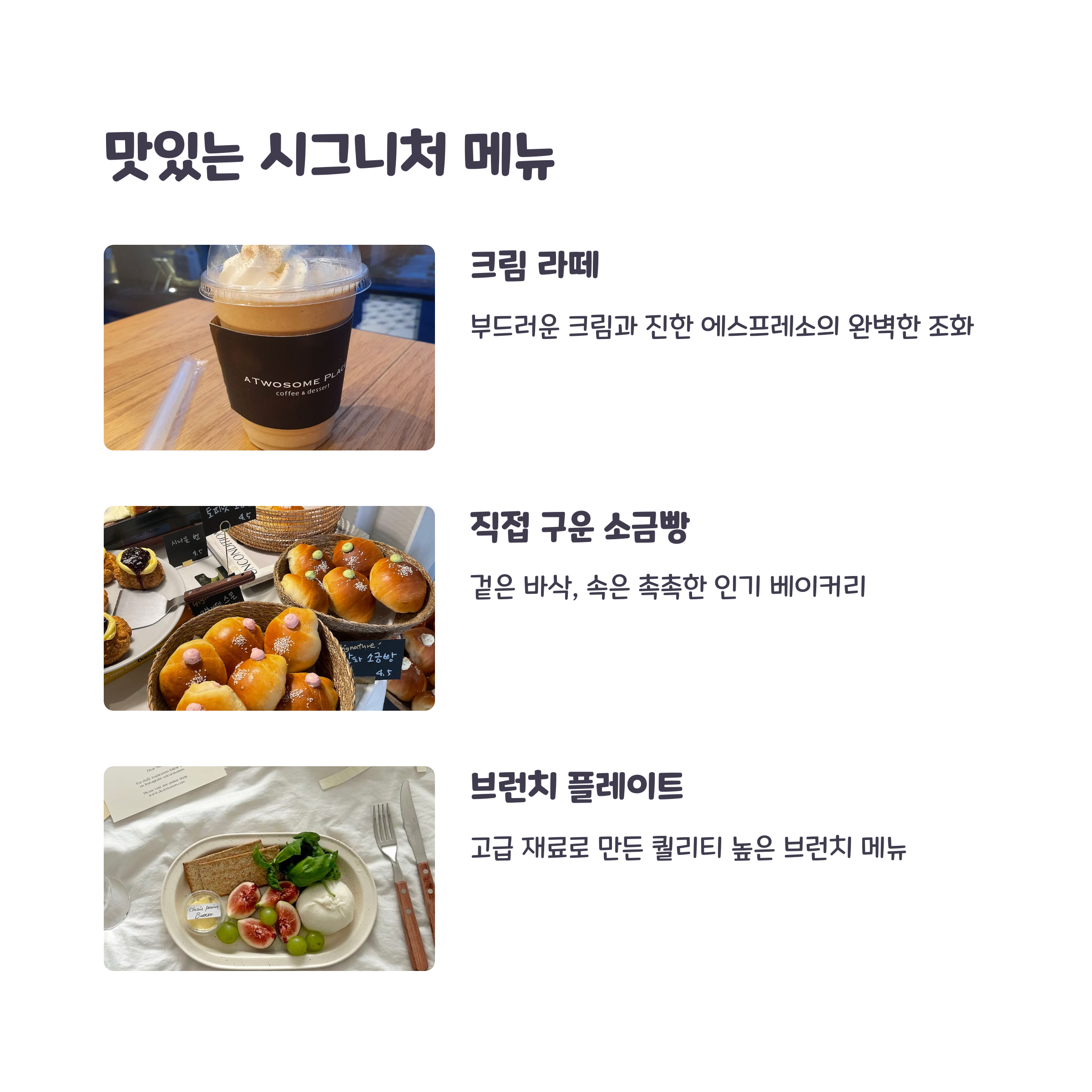 대표 메뉴는 시그니처 크림 라떼, 앙버터 소금빵, 파니니 브런치 등이며 커피와 디저트 모두 높은 퀄리티를 자랑합니다. 특히 크림 라떼는 달지 않고 진한 풍미로 인기가 많고, 디저트 비주얼도 훌륭해 사진 찍기 좋은 메뉴가 많습니다. 브런치류도 식사 대용으로 충분해 가볍게 식사하며 데이트하기 좋습니다.