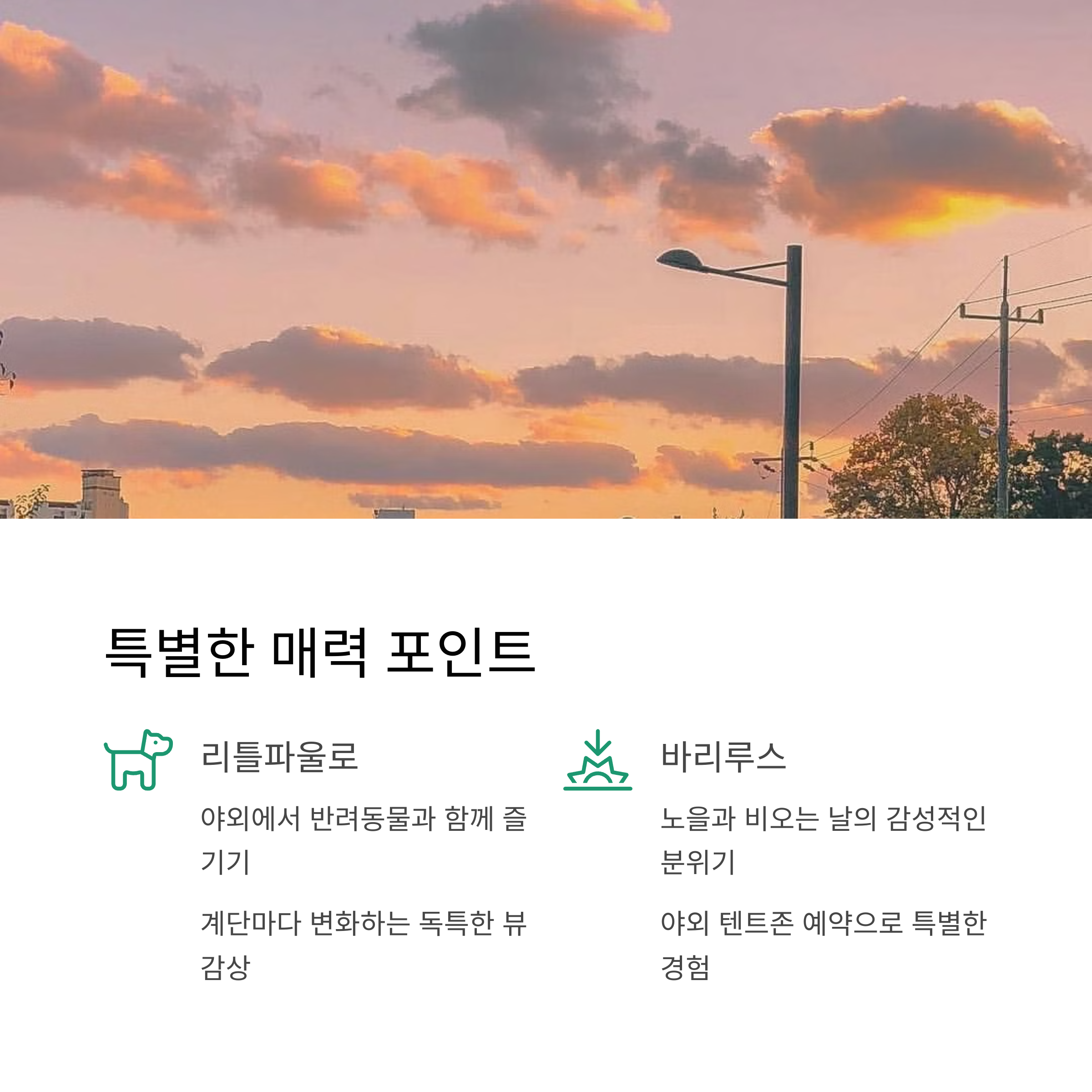 리틀파울로 – 반려동물 야외 동반, 포토존 다수 바리루스 – 노을 뷰, 텐트존 예약제, 대형 주차장 |