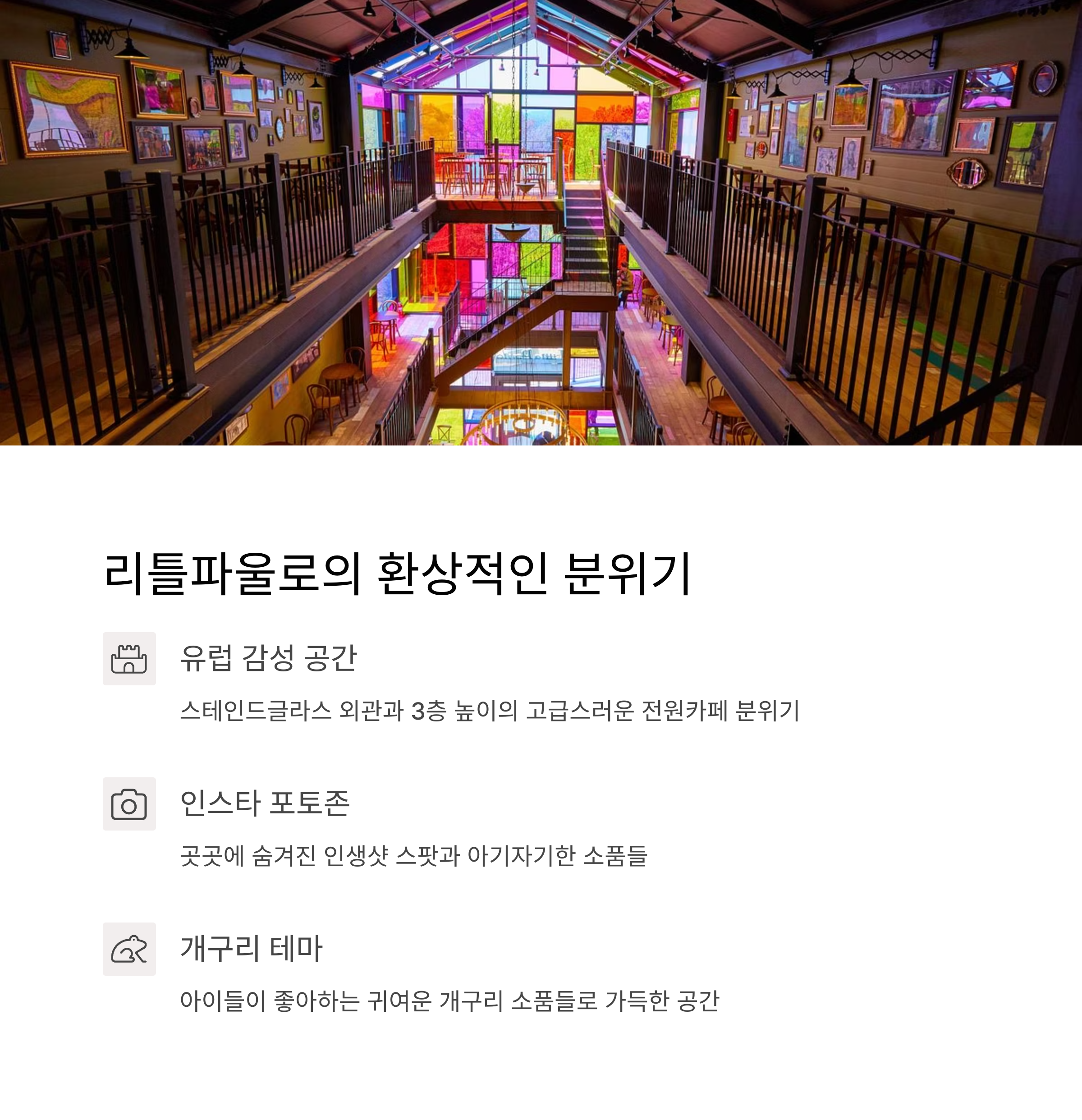 리틀파울로는 동화 같은 외관과 유럽풍 감성이 살아 있는 카페로, 스테인드글라스 외관과 3층 구조의 다양한 포토존이 돋보입니다. 계단마다 풍경이 달라져 계속해서 새로운 공간을 탐험하는 재미가 있으며, 아기자기하고 독특한 인테리어 덕분에 가족 단위 방문객과 커플 데이트 코스로 인기입니다.