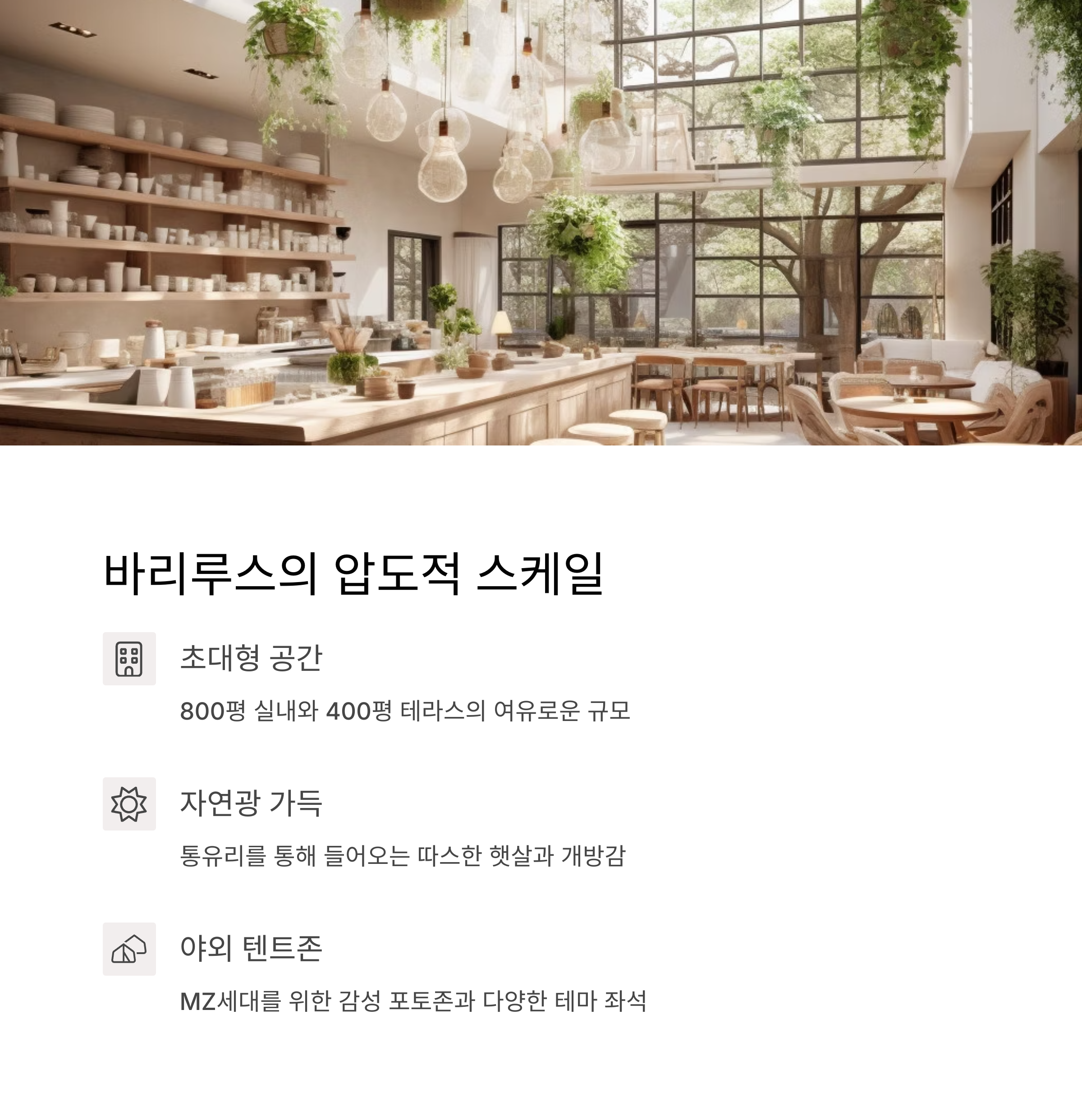 바리루스는 무려 800평 규모의 실내 공간과 400평 테라스를 갖춘 초대형 감성 카페로 자연광 가득한 통유리 인테리어, MZ 취향의 포토존, 텐트존, 바깥 전망까지 복합문화공간 같은 다채로운 구성이 특징입니다. 시그니처 브런치 메뉴와 수제 플래터, 직접 조리된 음식들도 한 끼 식사로도 손색없는 만족도 높은 구성을 자랑합니다.