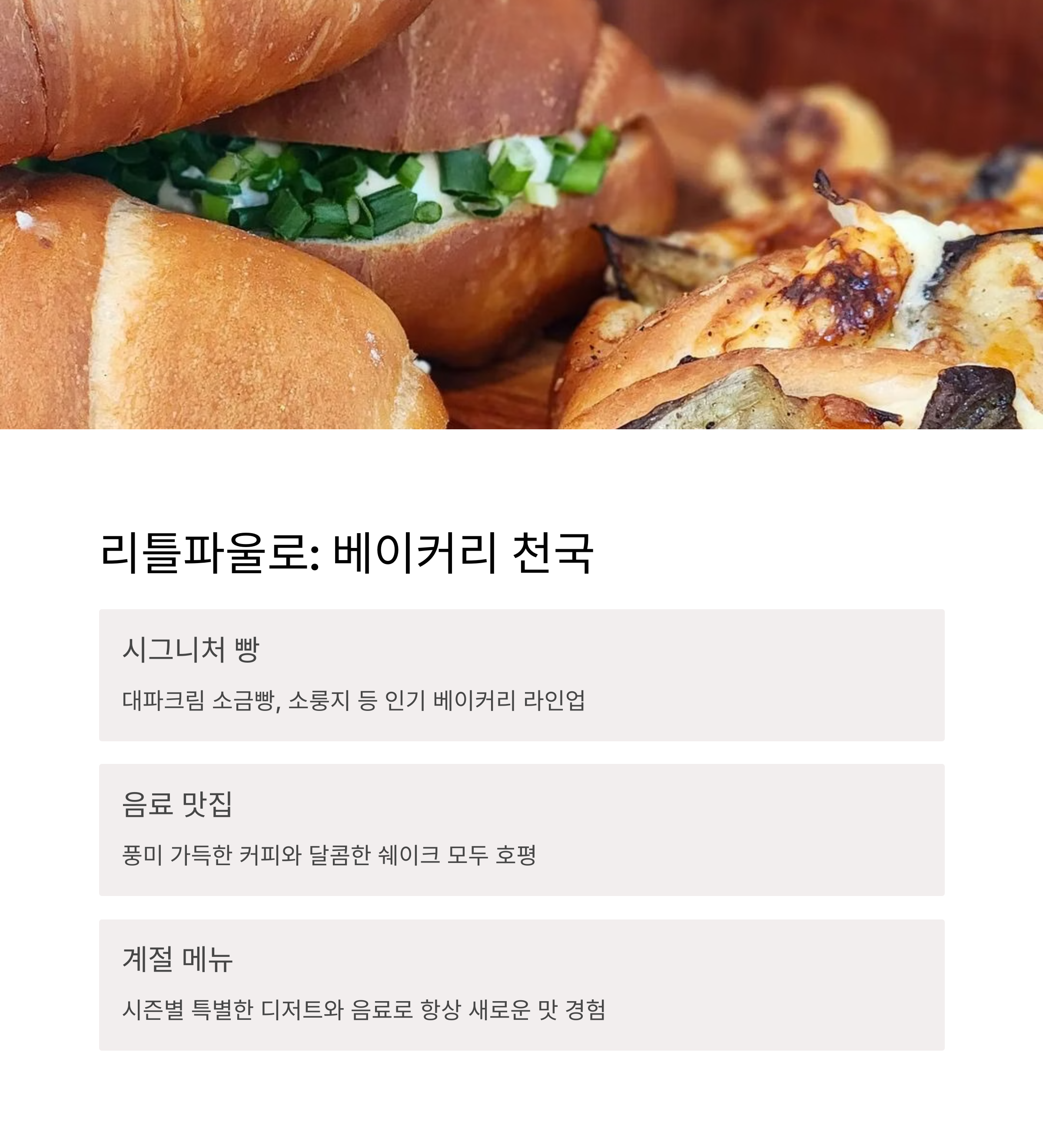 리틀파울로 – 대파 소금빵, 소금빵 시리즈, 시그니처 음료 바리루스 – 브런치 플래터, 바리슈페너 |