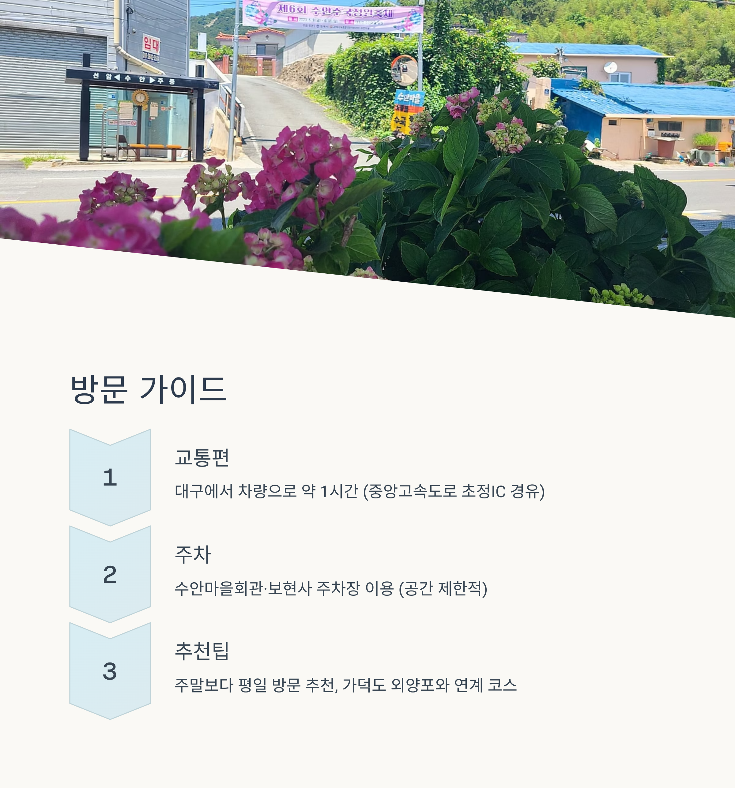 수안마을 수국 축제는 당일치기 여행지로서 최고의 조건을 갖추고 있습니다. 대구에서 차로 1시간 내외 거리로 부담 없이 방문할 수 있고, 축제 기간 외에도 아름다운 수국과 풍경을 감상할 수 있어 사계절 내내 찾는 이가 많습니다. 여유로운 일정이 가능하다면 가덕도 외양포와 연계하여 드라이브 코스로 구성해보는 것도 추천드립니다. 주차 공간이 협소한 만큼 평일 방문을 권장하며, 사전 정보를 체크한 후 방문하는 것이 좋습니다.