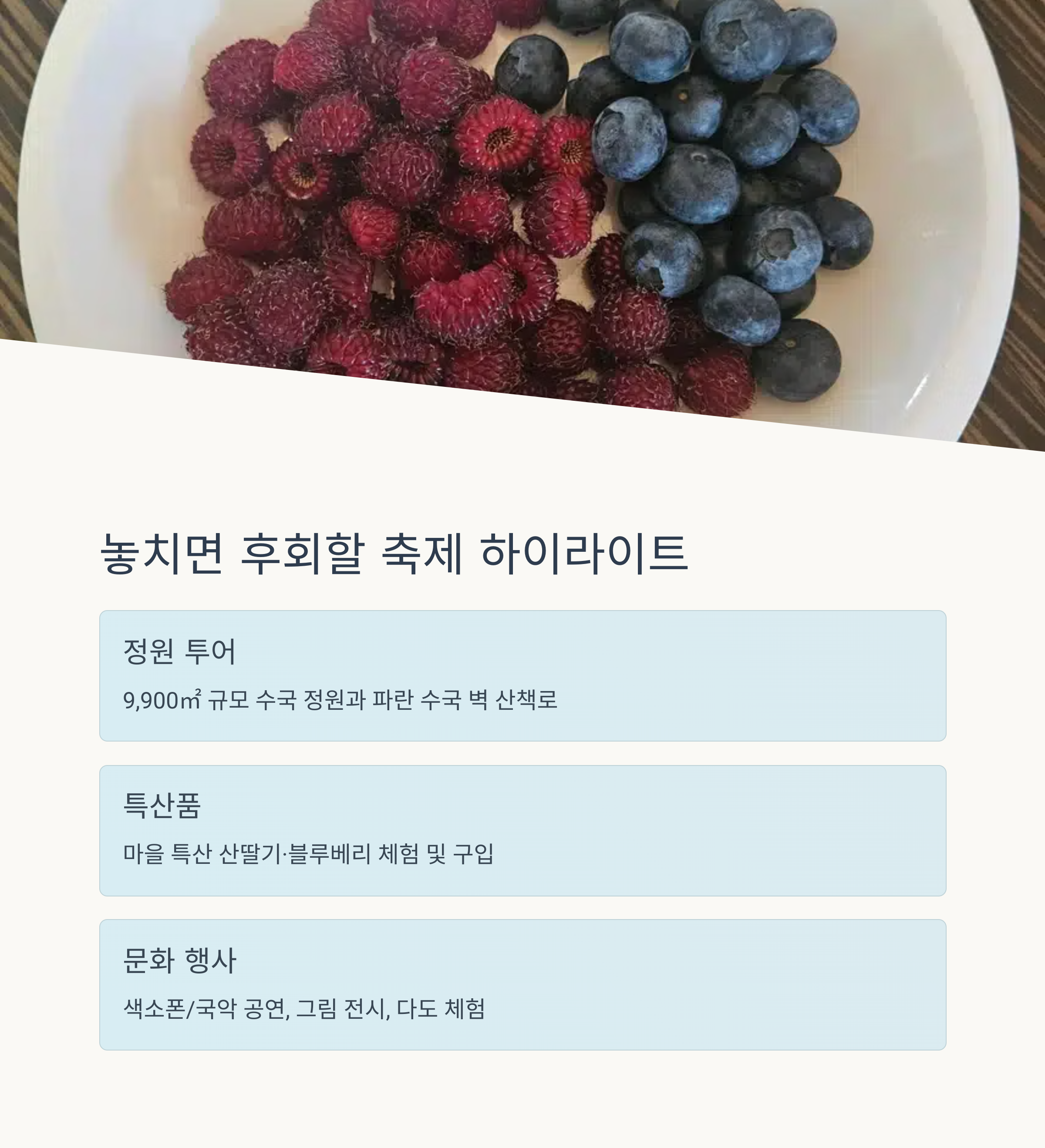 축제 기간 동안에는 단순히 꽃을 보는 즐거움 외에도 다양한 체험과 전시, 공연이 마련되어 있어 온 가족이 함께 즐길 수 있습니다. 마을 특산품인 산딸기와 블루베리를 직접 맛볼 수 있으며, 부녀회에서 운영하는 수제 먹거리 코너는 많은 방문객들에게 큰 인기를 끌고 있습니다. 지역 사회와 방문객이 함께 어우러지는 이 축제는 마을의 활기를 더하며, 소중한 지역 문화로 자리 잡아가고 있습니다.