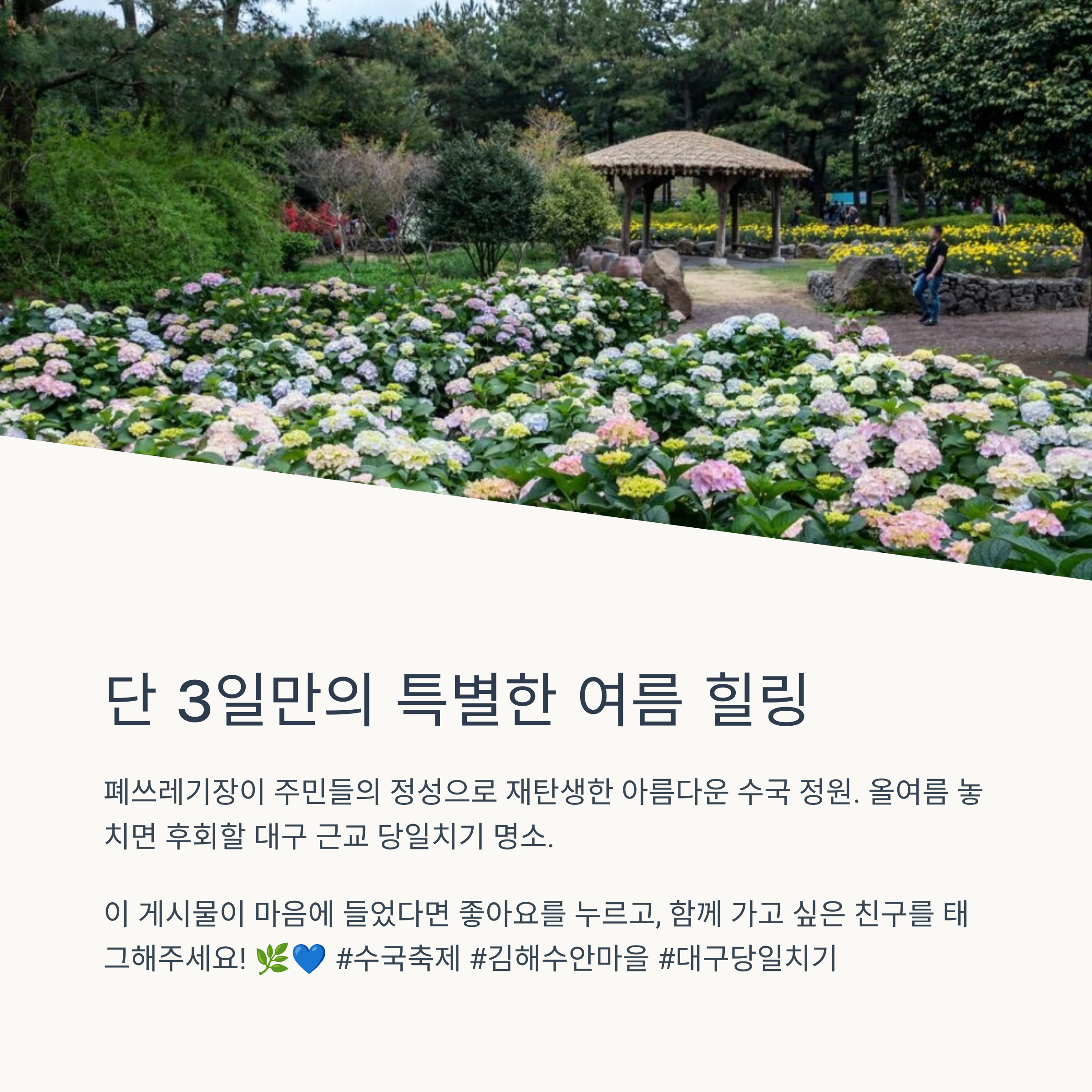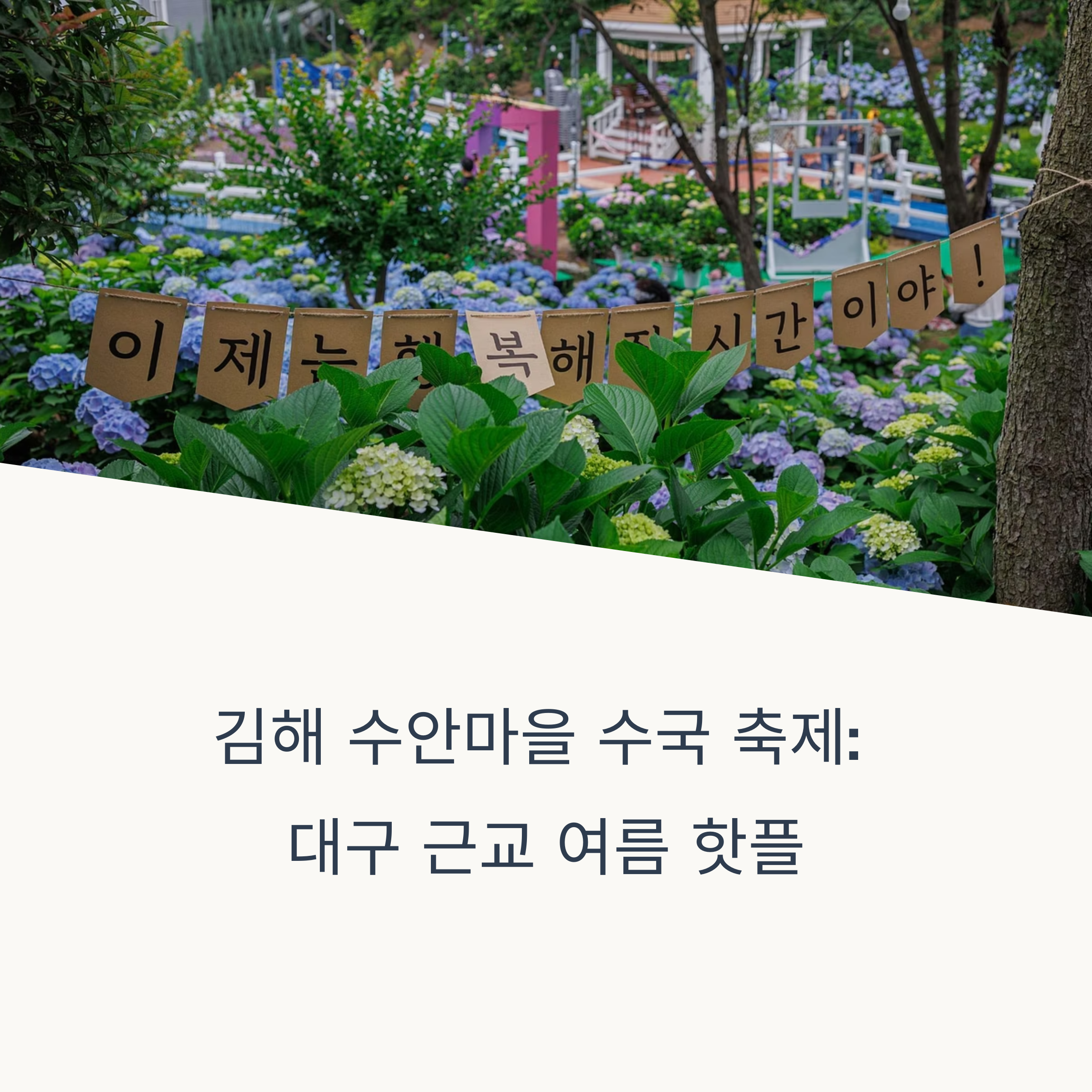 여름이 다가오면 여행을 계획하시는 분들이 많습니다. 특히 도심에서 가까운 당일치기 여행지를 찾는다면 더더욱 반가운 소식이 아닐 수 없죠. 이번 글에서는 대구 근교에서 짧지만 인상 깊은 여행을 즐길 수 있는 김해 수안마을 수국 축제를 소개드리려 합니다. 예전에는 쓰레기장이었던 이 마을이 지금은 수국으로 가득한 명소가 되었다는 사실, 알고 계셨나요? 주민들의 정성어린 손길로 바뀐 이곳은 방문객들에게 감동을 전하고 있습니다. 형형색색 수국과 함께 펼쳐지는 마을 축제, 그리고 여름철에만 느낄 수 있는 청량한 대나무숲 산책까지. 마음의 휴식을 찾고 싶다면 이번 축제를 절대 놓치지 마세요. 누구나 가볍게 다녀올 수 있는 코스이기에, 주말 나들이나 평일 힐링에도 제격입니다. 가족, 친구, 연인과 함께 추억을 만들 수 있는 좋은 기회가 될 것입니다. 지금부터 수안마을의 매력을 하나씩 알아보겠습니다.