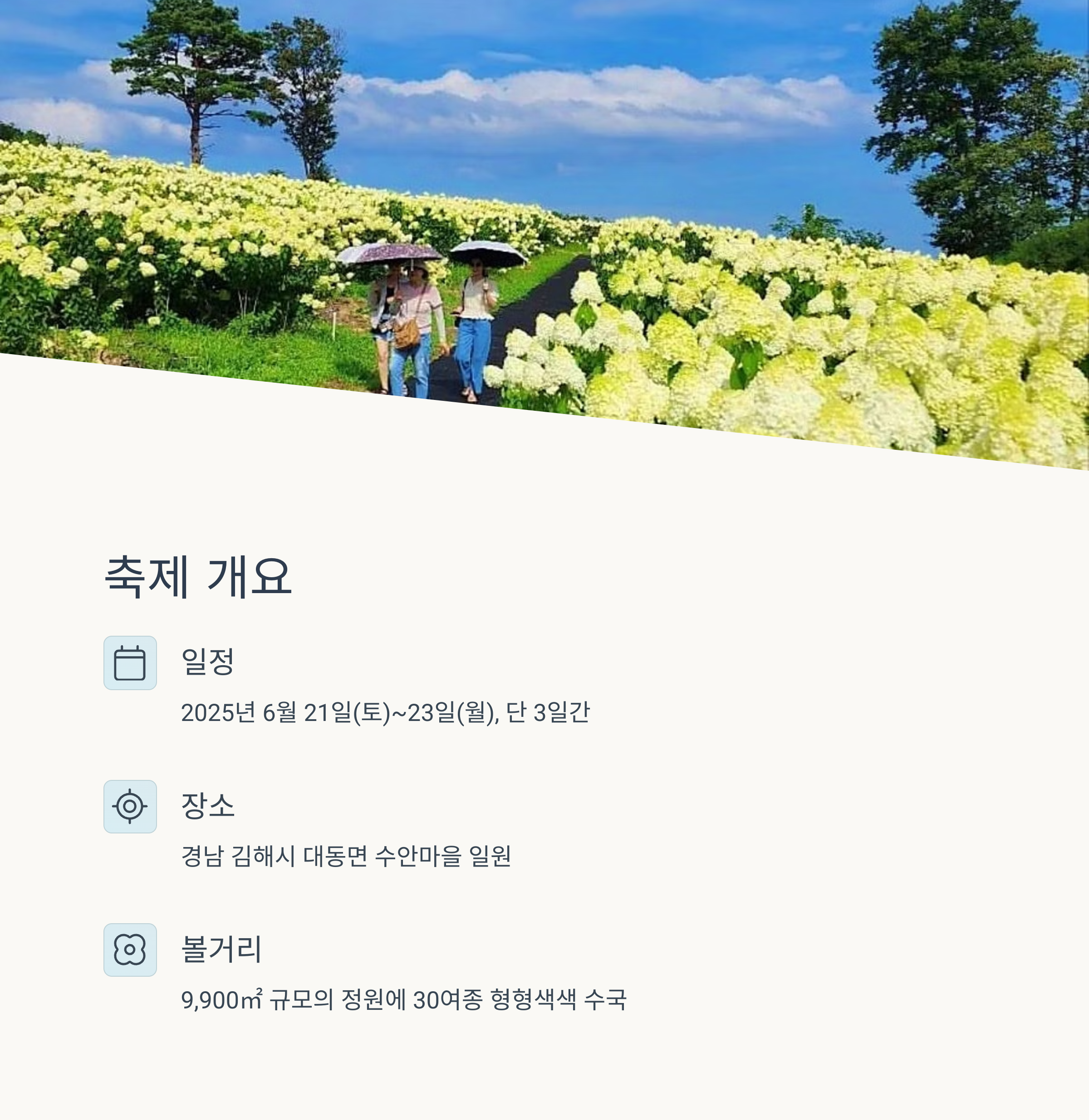 | 축제 날짜 | 수국 명소 | 여행 팁 |