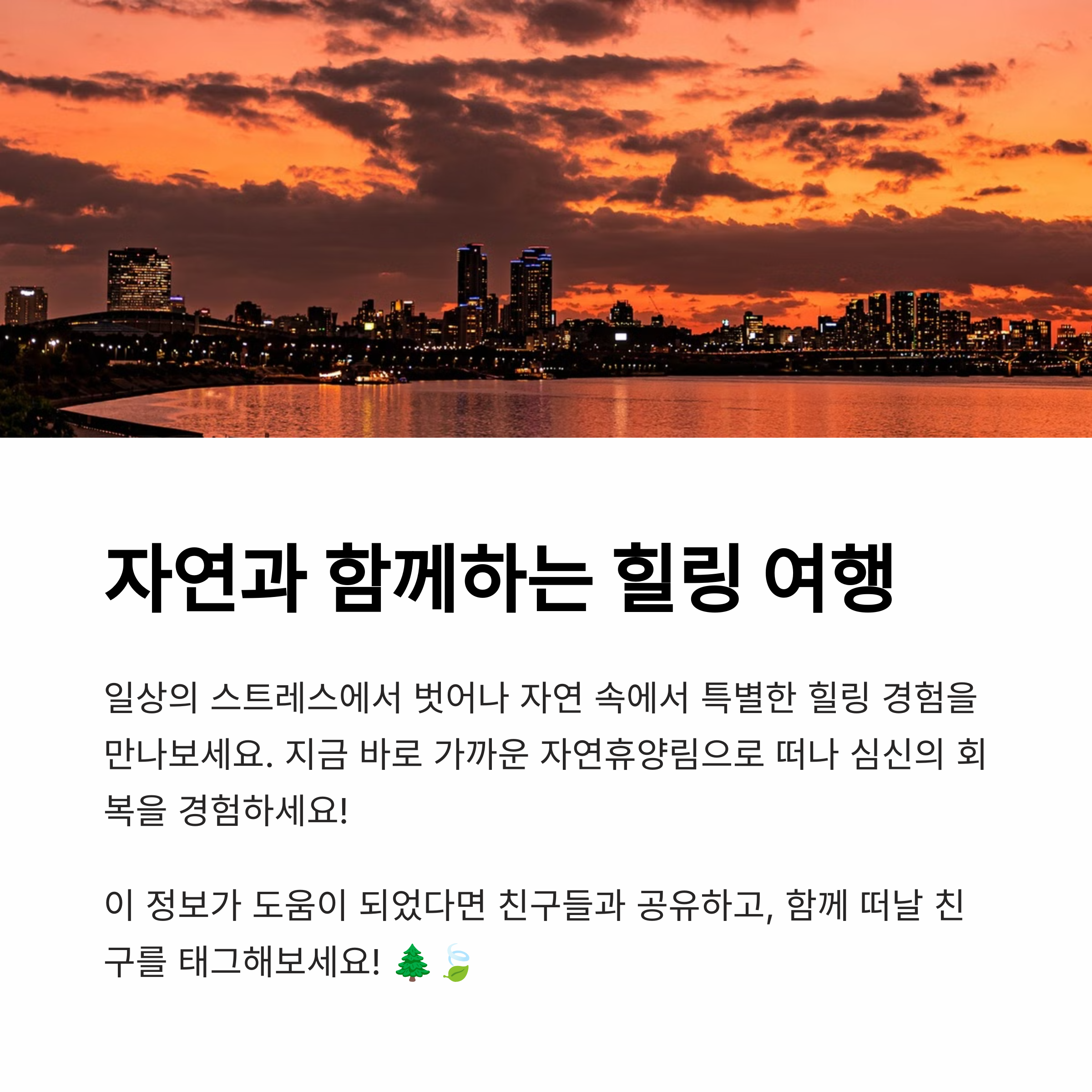 빠르게 흘러가는 일상 속에서 하루쯤은 숲 속에서 여유롭게 보내는 시간이 정말 소중하게 느껴집니다. 자연휴양림은 누구에게나 열린 공간이며, 아이부터 어른까지 모두가 즐길 수 있는 공감형 힐링 여행지입니다. 이번 주말, 복잡한 도시를 잠시 떠나 숲이 주는 위로와 안정을 느껴보는 것은 어떨까요? 자연이 전하는 진짜 힐링, 지금 바로 떠나보세요.