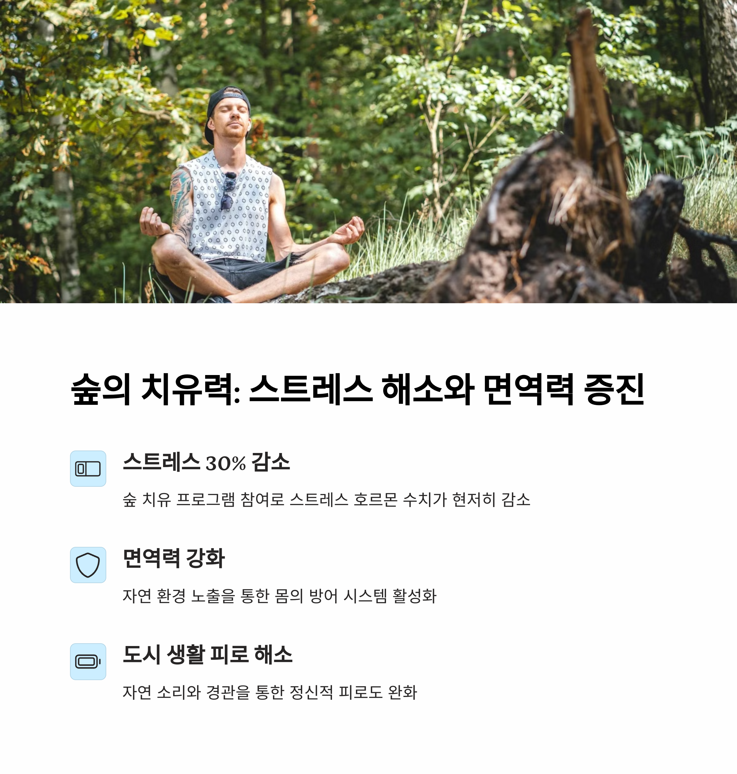 | 유명산, 대관령 등 전국 명소 다양 | 아이와 함께하기 좋은 가족형 콘텐츠 | 정서 회복 및 건강 증진 효과 입증 |