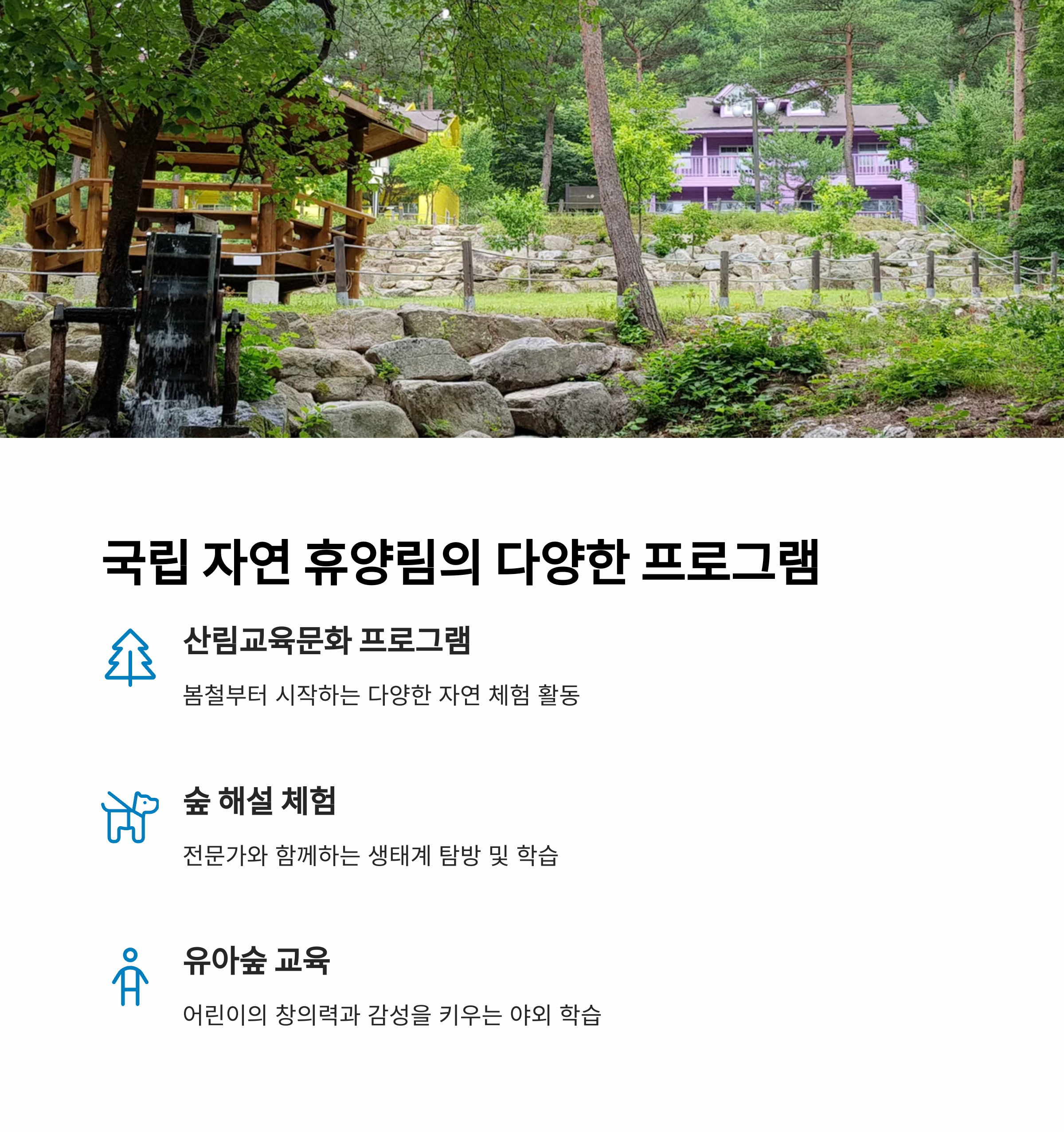 | 주요 프로그램 | 숲 해설, 산림치유, 유아숲체험 등 맞춤형 활동 |