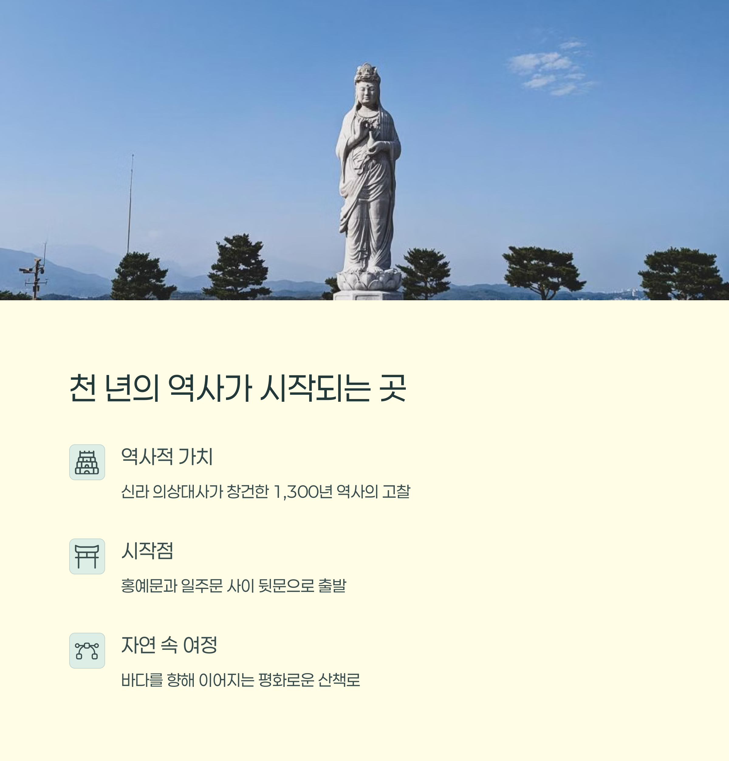 낙산사 의상대부터 홍련암까지 걷는 길은 단순한 산책 코스를 넘어 역사와 전설, 자연의 감동이 함께하는 여정입니다. 동해의 바다 내음을 느끼며 걷다 보면 어느새 마음까지 맑아지는 것을 느낄 수 있어요. 양양 여행 일정 중 여유로운 힐링 코스를 찾는다면 이 코스를 꼭 경험해보시길 추천합니다!
