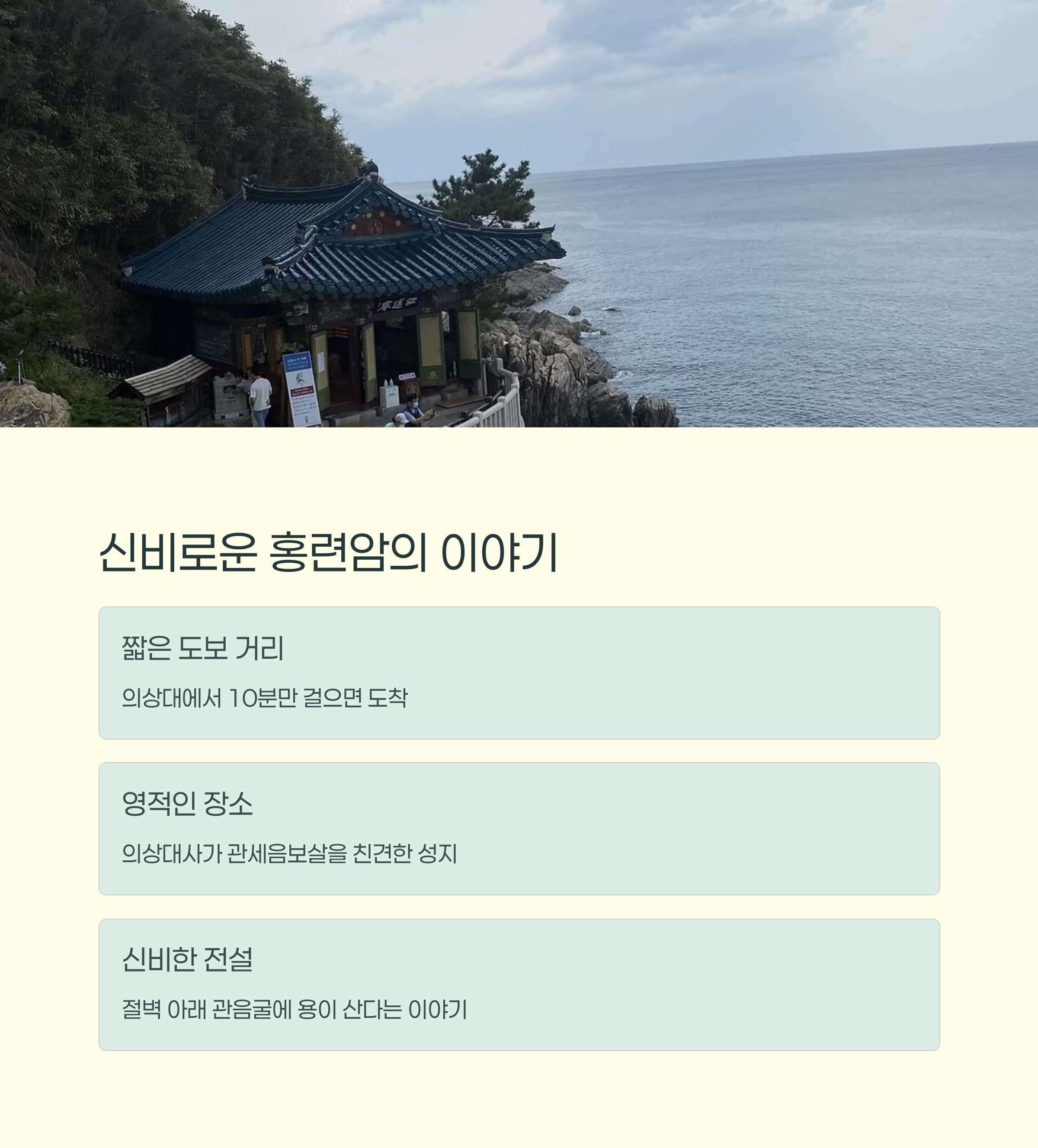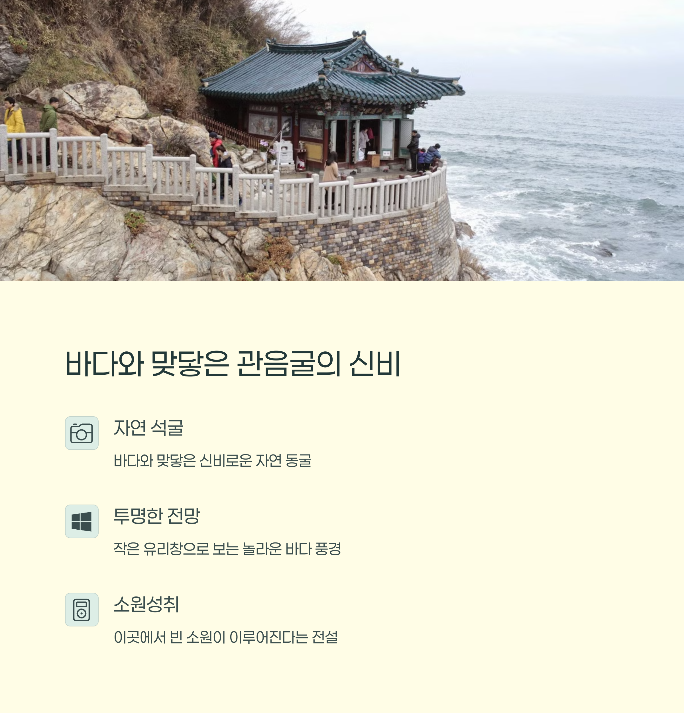 | 추천 대상 | 일출 명소를 찾는 분, 사찰 명상과 바다 풍경을 함께 즐기고 싶은 여행자 |