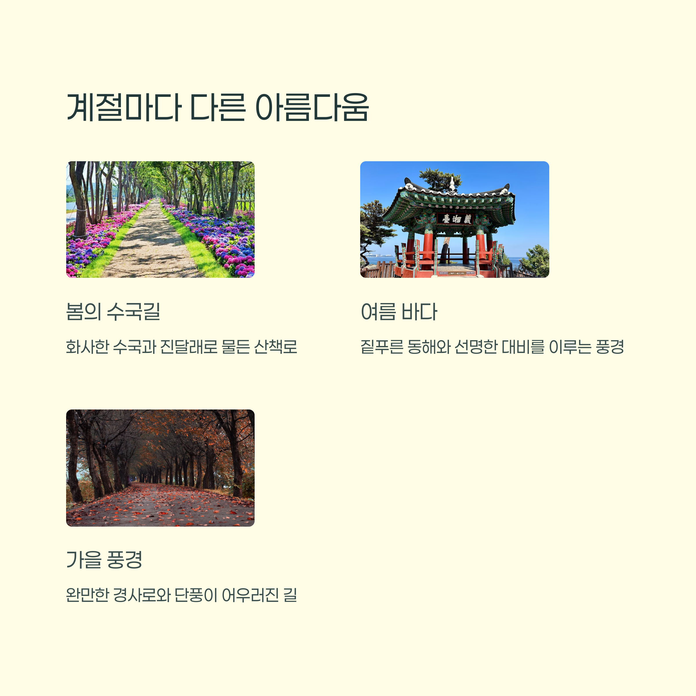 전체 코스는 넉넉히 잡아 1시간 30분~2시간 내외 소요되며, 일출 촬영, 기도, 포토타임을 포함할 경우 3시간까지 여유 있게 보시는 걸 추천해요. 산책로는 정비가 잘 되어 있어 운동화만 있으면 누구나 쉽게 다녀올 수 있으며, 단풍철, 수국철, 여름 피서철에도 많은 여행자들이 찾는 명소입니다.