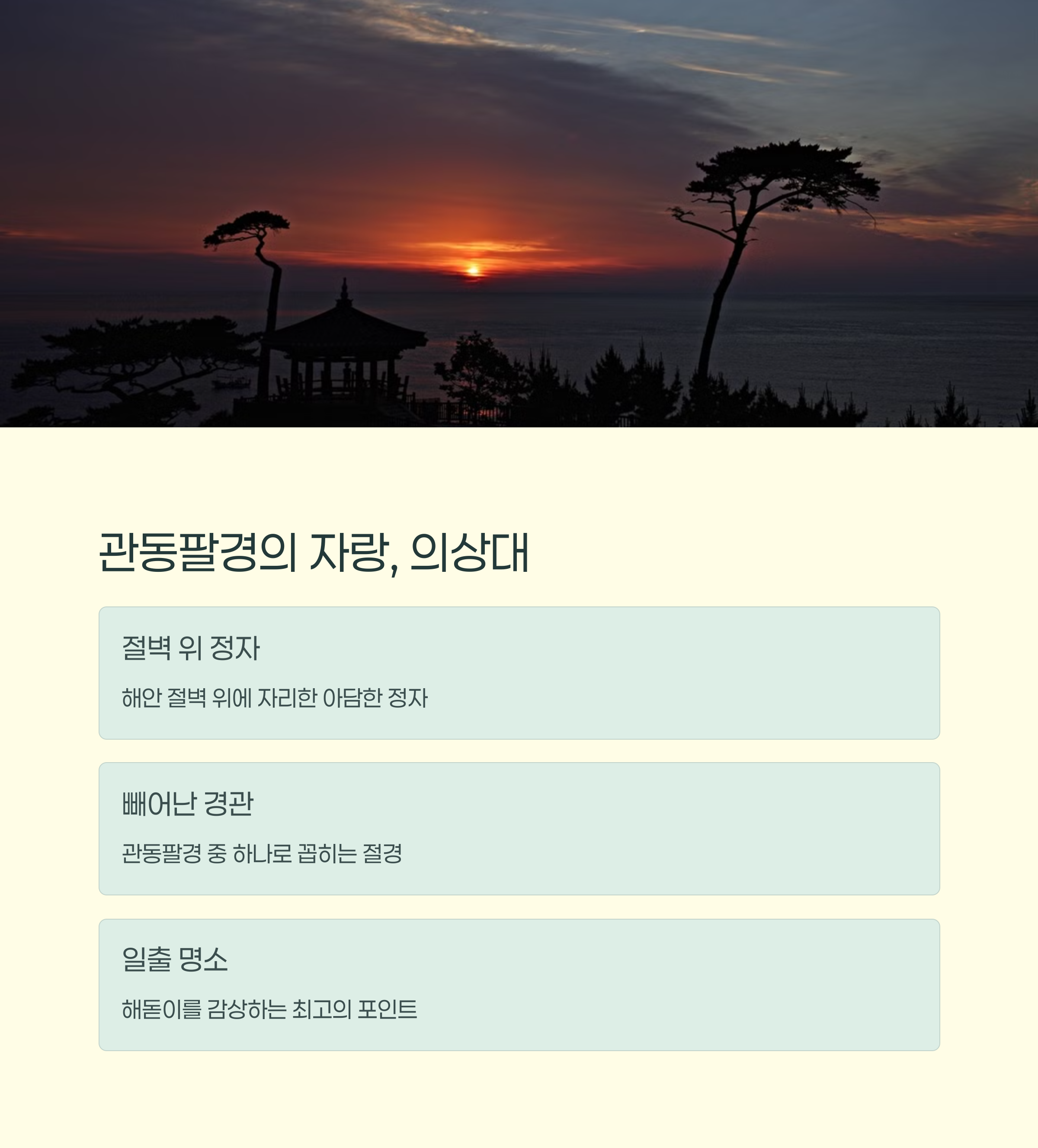 낙산사에서 출발해 의상대까지 이어지는 길은 해안을 따라 부드럽게 펼쳐지는 오르막 산책로입니다. 의상대는 절벽 위에 세워진 작은 정자로, 동해의 탁 트인 수평선을 가장 가까이에서 감상할 수 있는 곳으로 유명하죠. 특히 일출 명소로 손꼽히며, 붉게 물든 바다 위로 해가 솟는 장면은 많은 사람들이 새벽에도 찾아오는 이유이기도 합니다. 정자 안에 앉아 동해의 파도 소리를 들으면 자연 속 명상 공간에 머무는 듯한 평온함을 느낄 수 있어요.