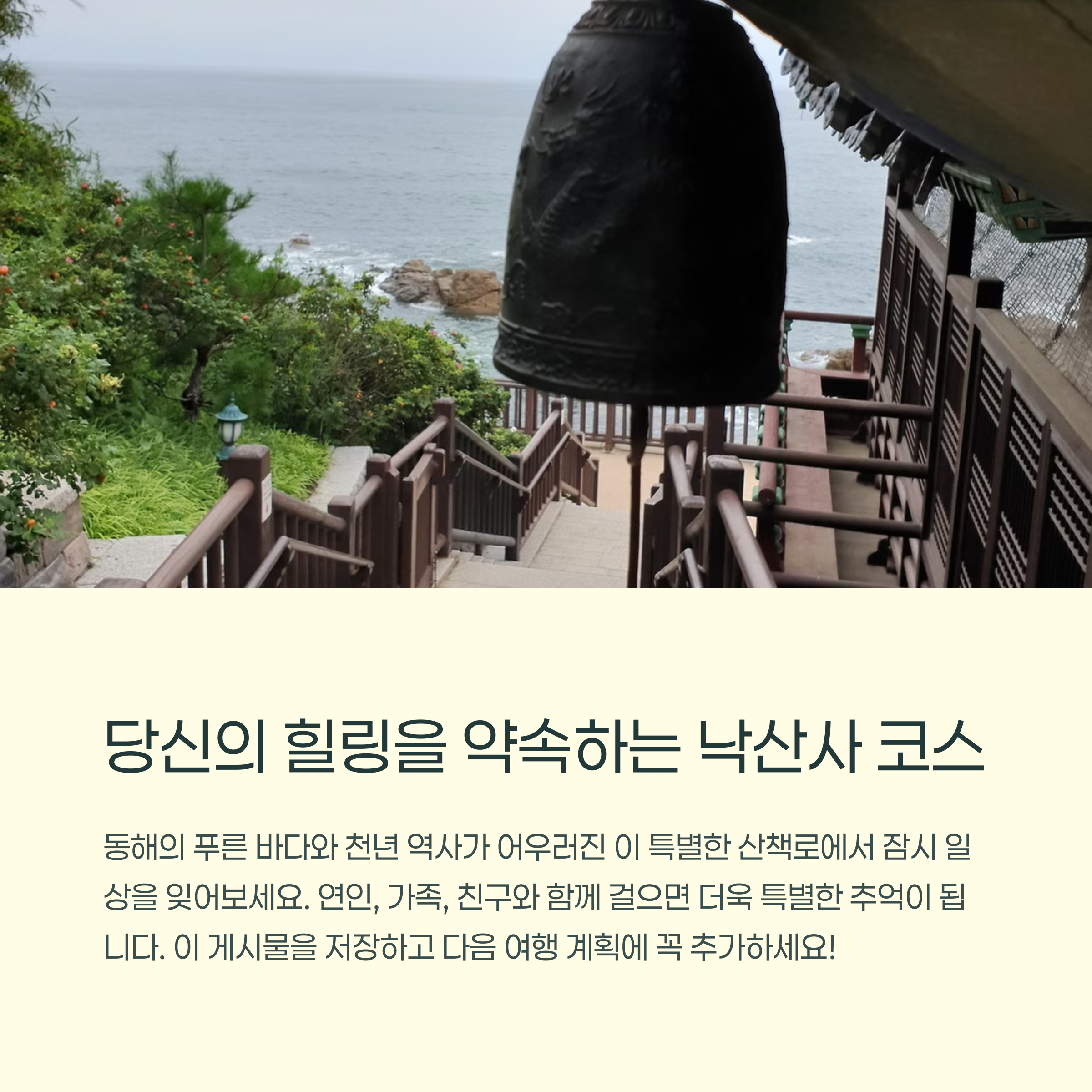일출, 명상, 포토스팟, 힐링 스토리 등 의상대~홍련암 구간에서 느낀 순간들을 댓글로 남겨주세요! 더 많은 분들과 함께 감동을 나눌 수 있어요.
