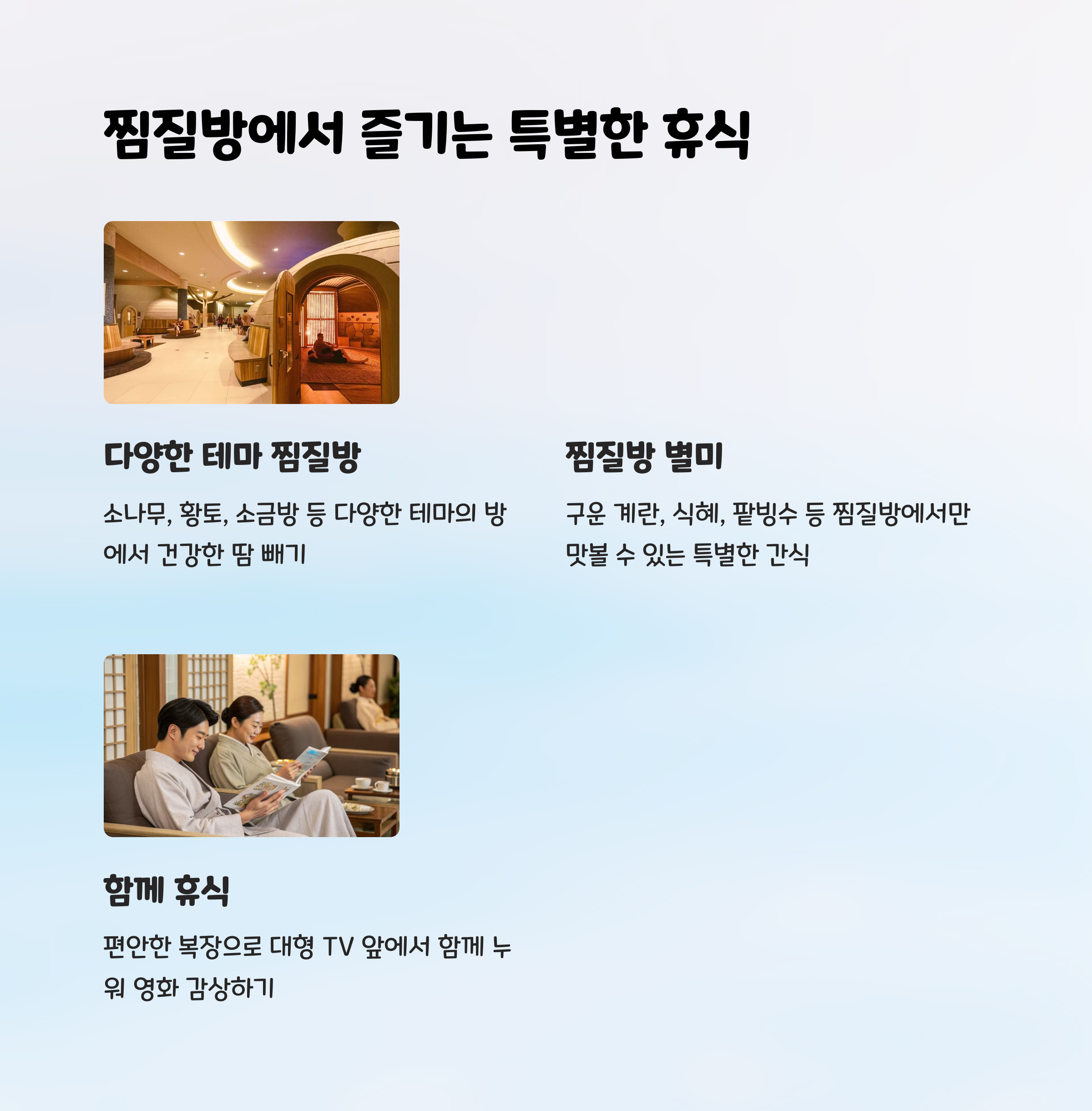 | 찜질방 힐링 | 오후에는 따뜻한 찜질방에서 여유롭게 피로를 풀며 하루를 마무리하세요. |
