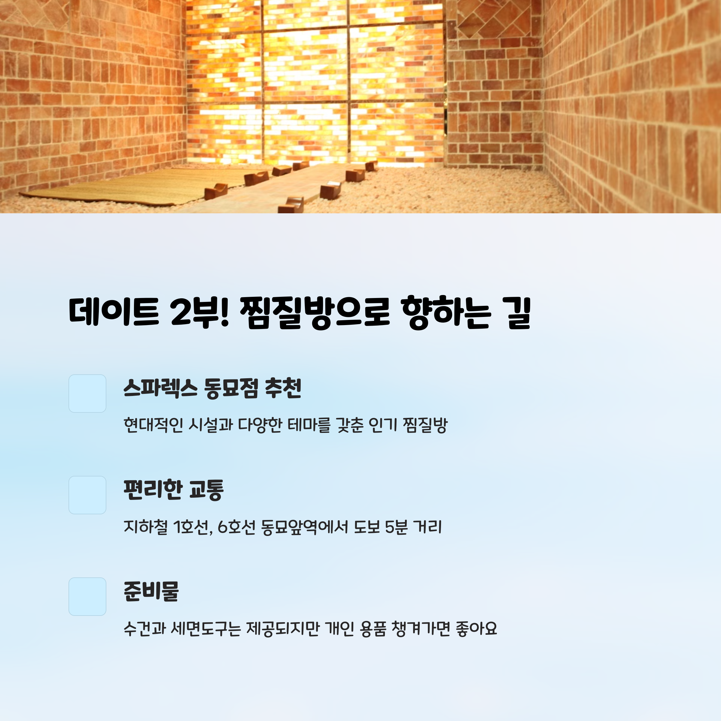 남산에서의 산책이 끝난 뒤에는 동묘앞역 근처에 위치한 찜질방 스파렉스로 이동하여 몸과 마음을 따뜻하게 힐링해보세요. 다양한 테마룸과 쾌적한 시설, 맛있는 간식은 데이트의 마무리를 완벽하게 만들어줍니다. 늦은 밤까지 운영되어 시간적 여유도 넉넉하며, 시끌벅적한 도심과는 달리 조용하고 편안한 분위기 속에서 둘만의 시간을 보내기에 안성맞춤입니다.