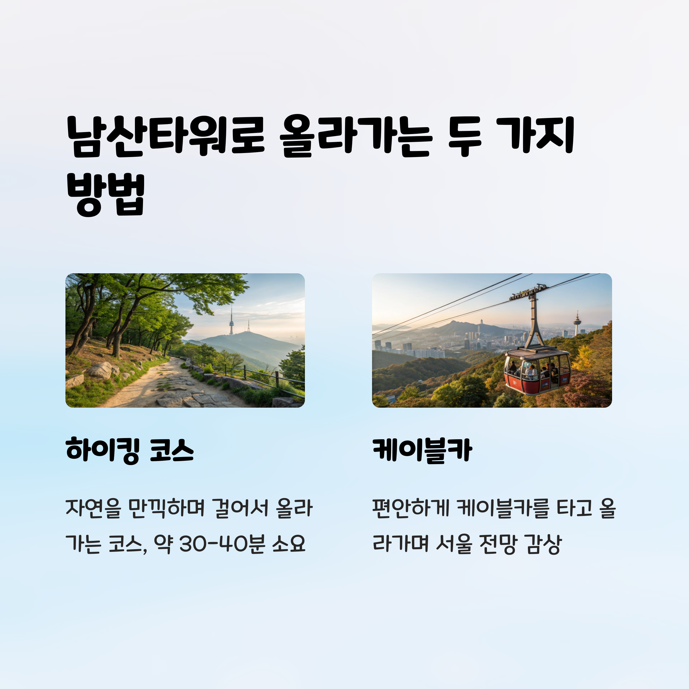 | 사계절 산책 가능, 서울 전망, 벚꽃 명소 | 케이블카, 사랑의 자물쇠, 전망대 | 스파렉스, 힐링 공간, 야간 데이트 |