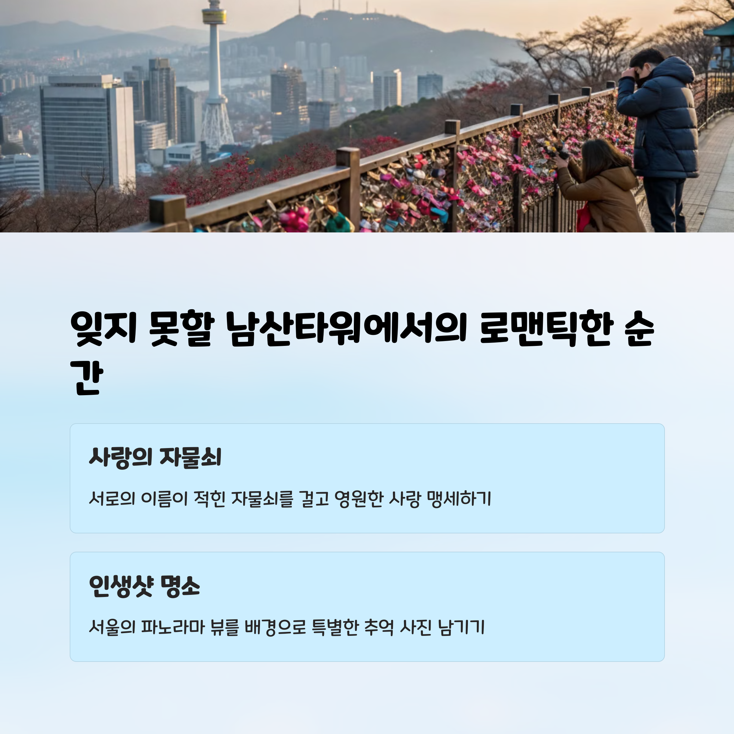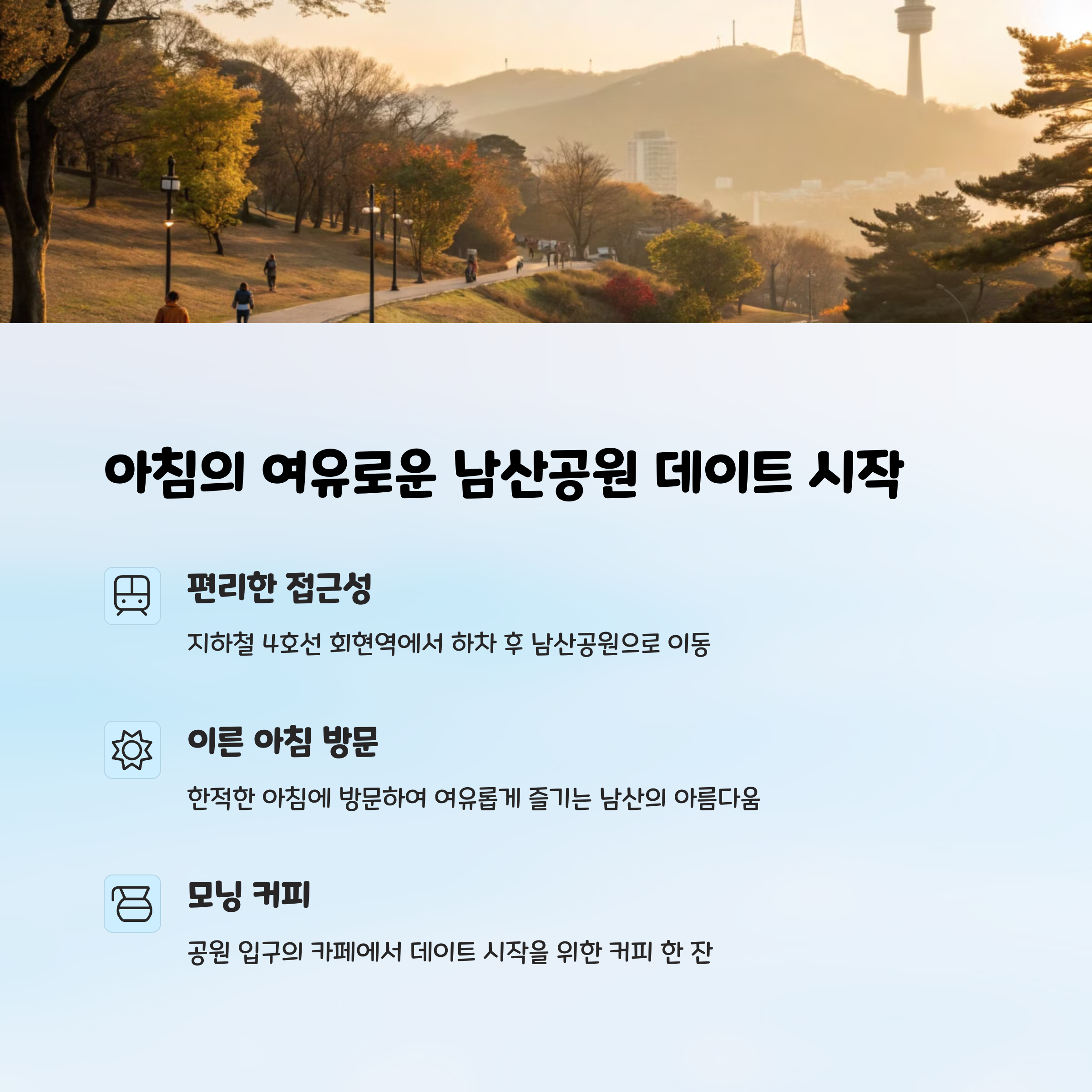 | 남산공원 데이트 | 오전 시간대에 한적하게 산책하며 풍경과 전망을 즐길 수 있어요. |