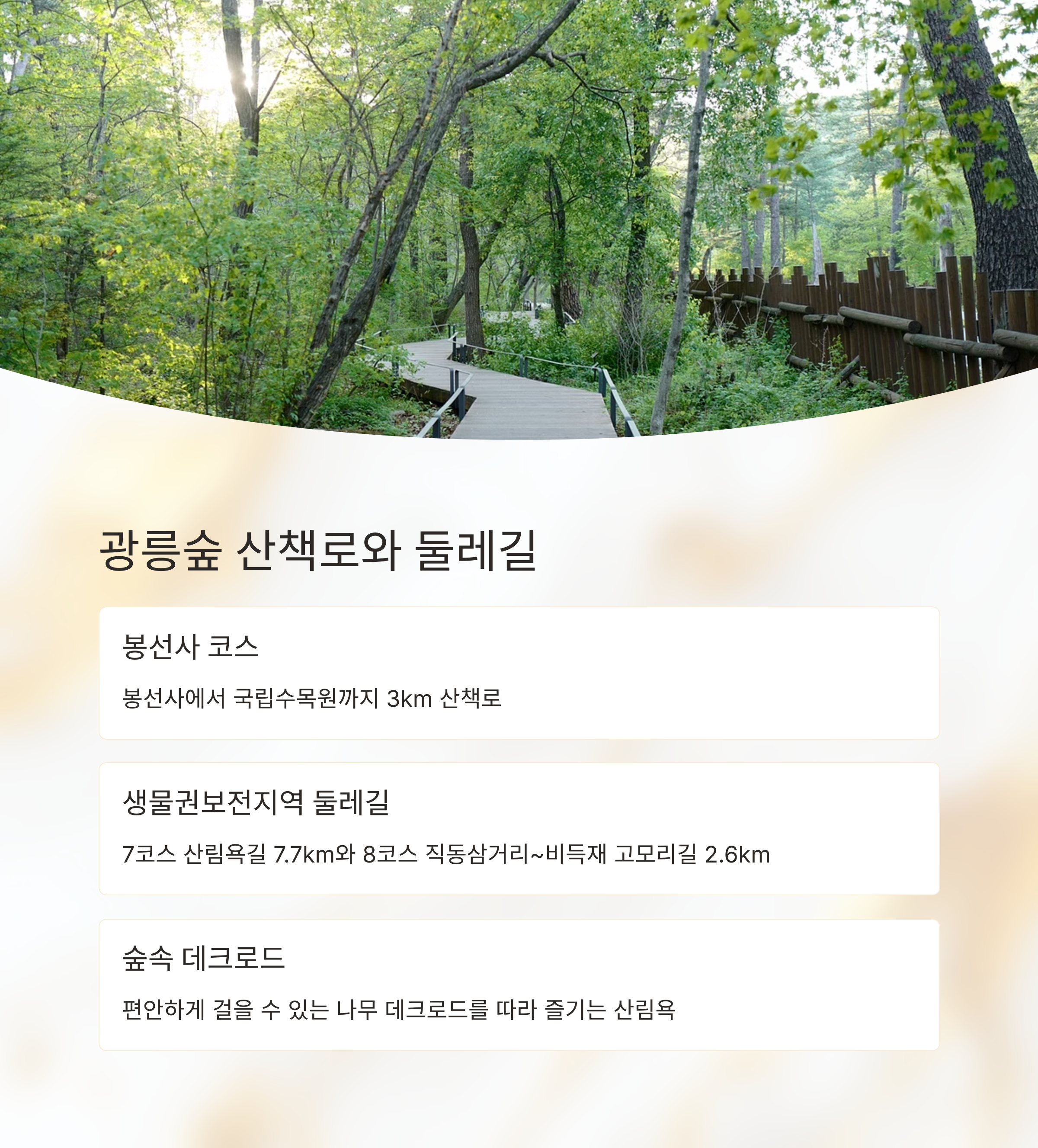 포천~남양주 잇는 4km 숲길 드라이브 코스 국립수목원~봉선사 3km 힐링 산책 코스 광릉숲축제 기간, 숲길 개방과 공연·체험 운영