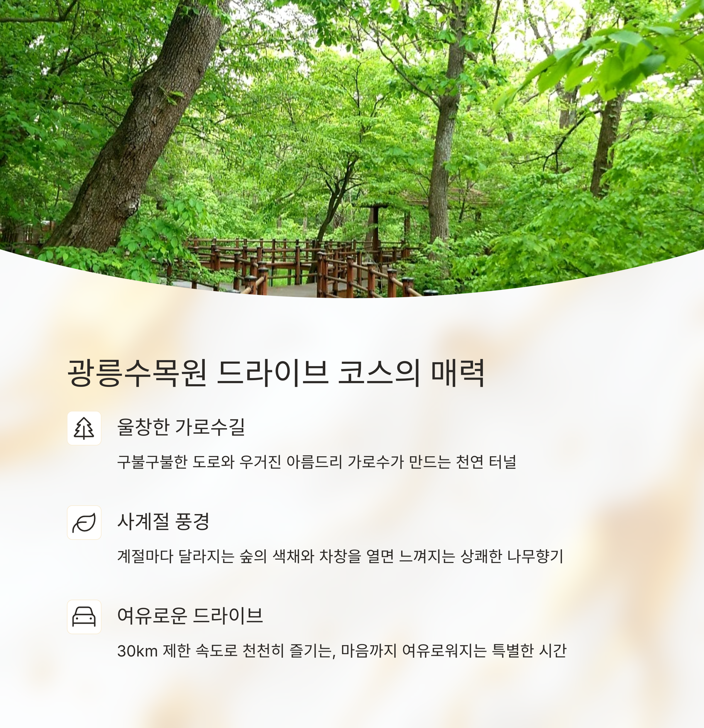 바쁜 일상에서 벗어나 자연의 품에서 쉬어가고 싶다면, 남양주 광릉수목원 드라이브 코스를 추천합니다. 포천과 남양주를 잇는 약 4km의 광릉수목원 숲길은 구불구불한 도로와 울창한 가로수가 어우러져 천천히 차창을 열고 달리면 숲의 향기와 계절의 풍경을 온몸으로 느낄 수 있는 서울 근교 대표 드라이브 명소입니다. 특히 국립수목원 정문에서 봉선사 입구까지 이어지는 길은 사계절 아름다운 ‘명품 숲길’로 불리며 드라이브는 물론 산책과 사색의 시간까지 즐길 수 있어 힐링을 원하는 모든 이들에게 추천되는 자연 여행 코스입니다.