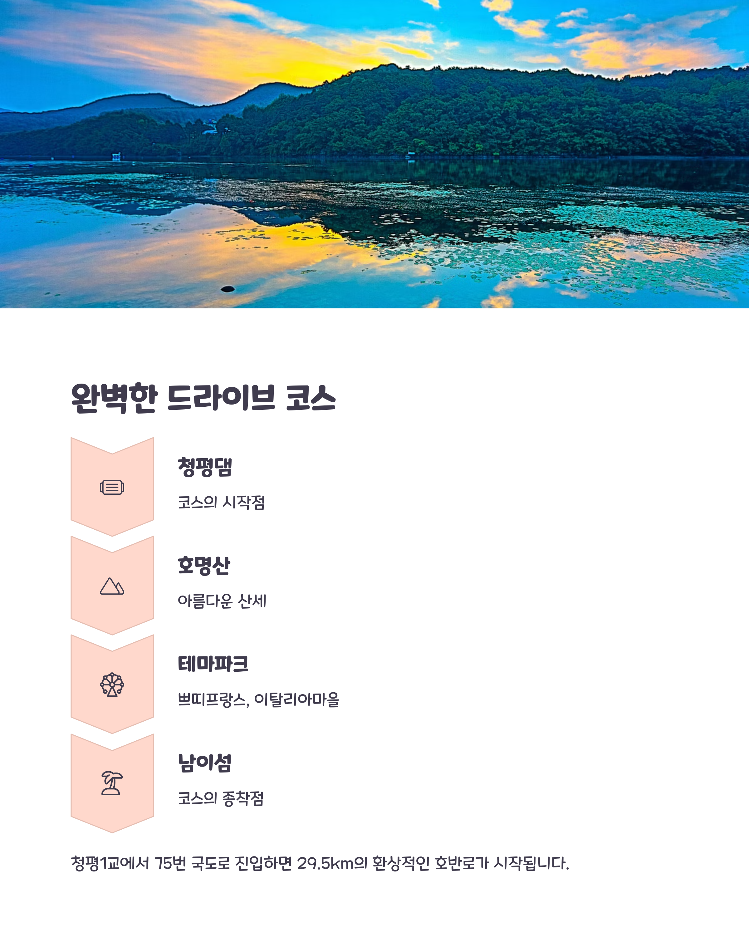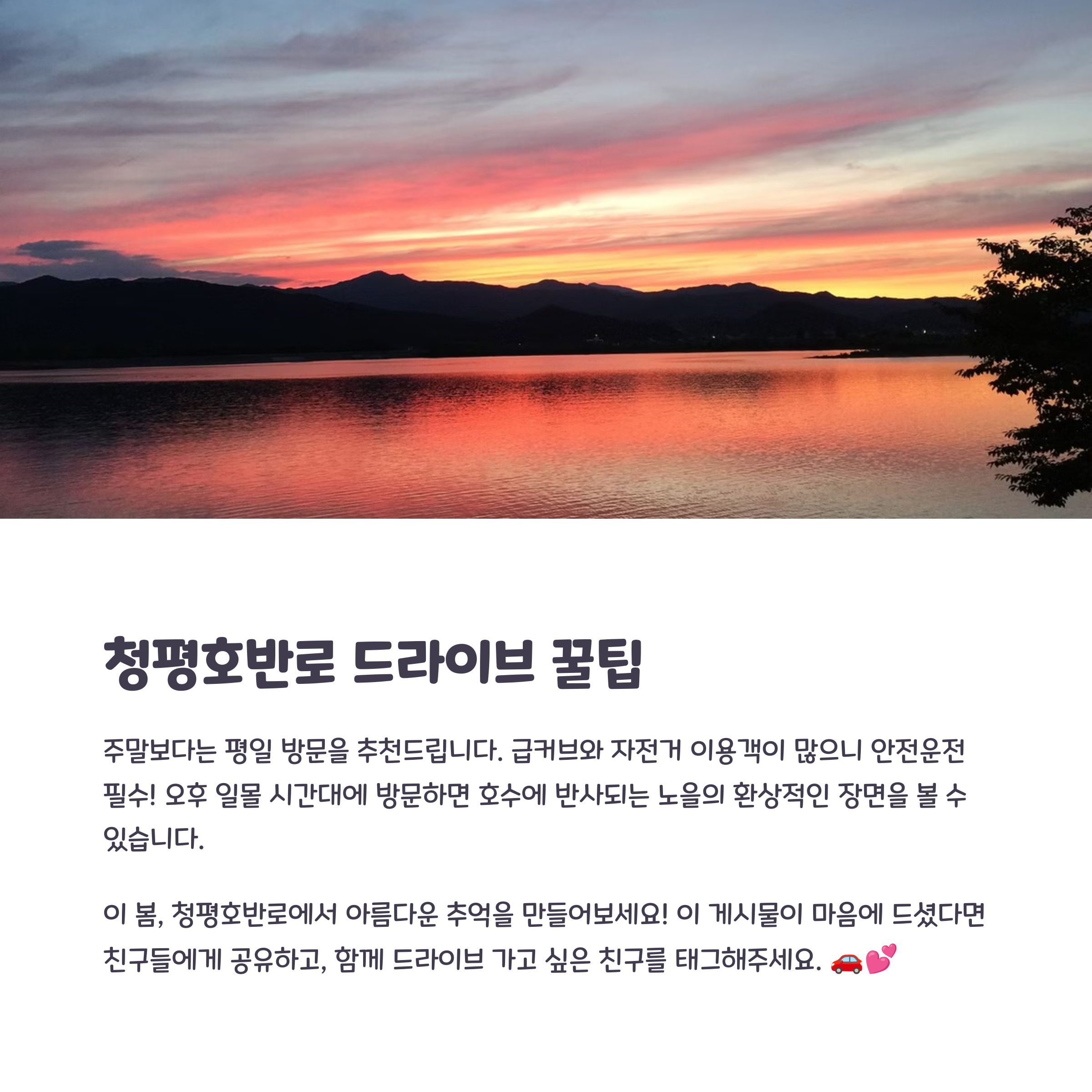 이번 봄, 어디론가 떠나고 싶은 마음이 들었다면 복잡한 도심을 벗어나 청평호반로를 따라 드라이브를 떠나보세요. 탁 트인 호수와 산이 조화를 이루는 풍경, 아기자기한 테마파크와 여유로운 분위기의 카페들, 그리고 안전하게 잘 정비된 도로까지 모든 것이 완벽한 드라이브 여행을 완성시켜 줍니다. 특히 가족이나 연인과 함께라면 더욱 특별한 추억이 될 것입니다. 눈으로 보고 마음으로 느끼는 청평호의 풍경은 잊지 못할 감동을 선사하며, 일상에 지친 이들에게 잠시의 휴식과 힐링을 제공합니다.