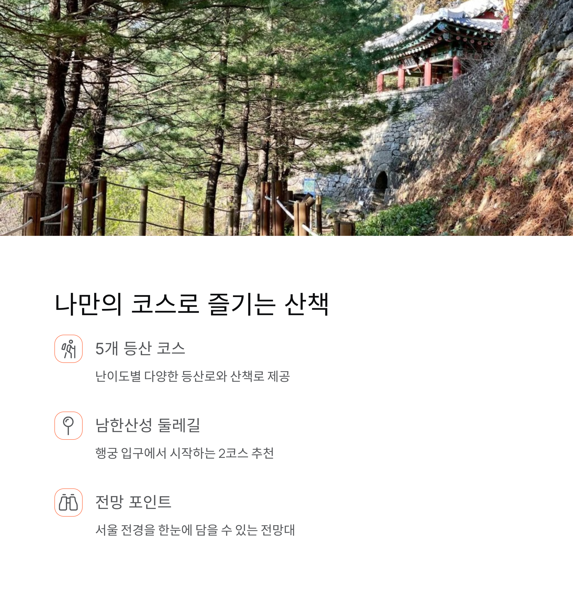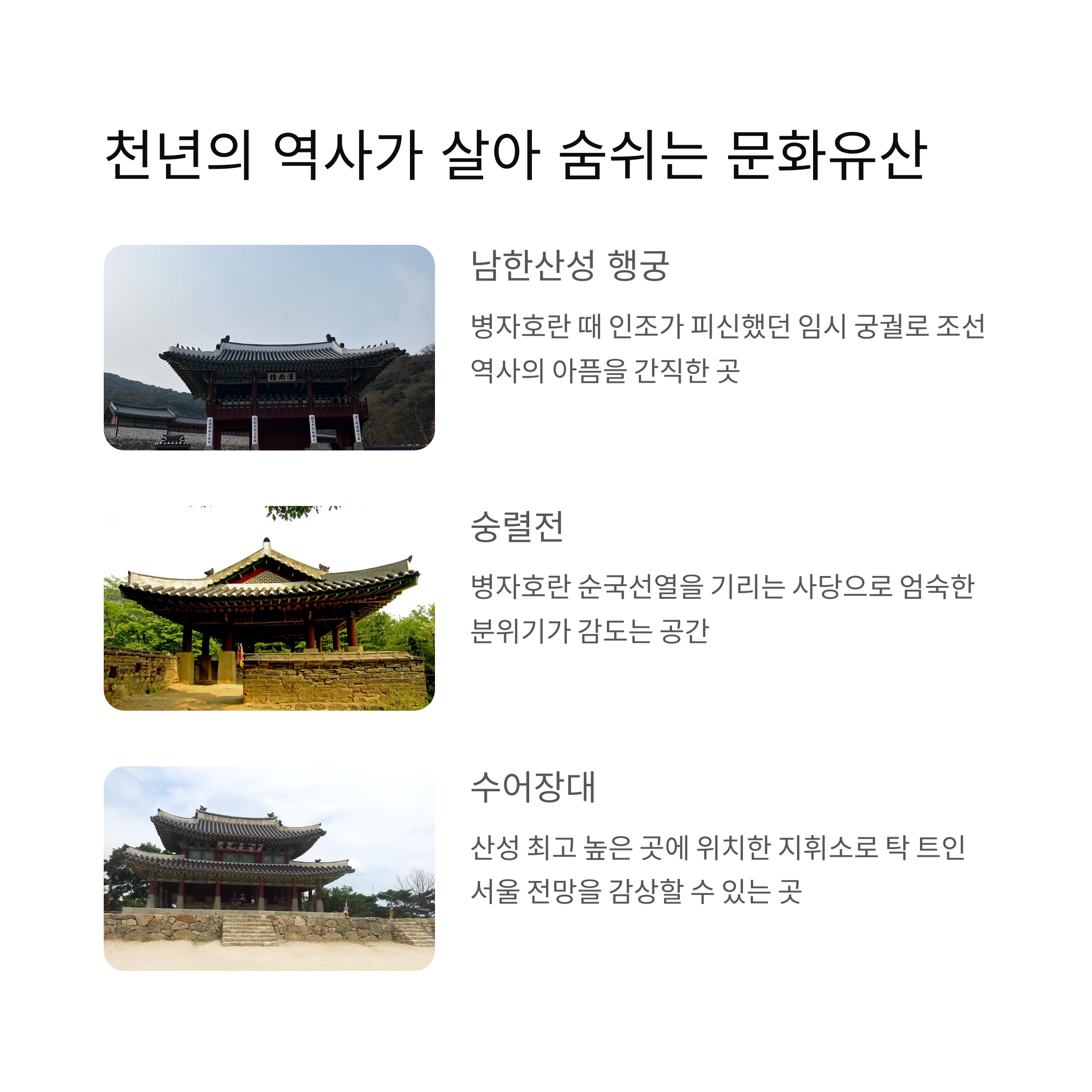 서울에서 30~60분 내외 거리의 드라이브 코스 남한산성 행궁, 수어장대 등 유적지 탐방 벚꽃, 단풍, 설경 등 계절별 풍경이 아름다움