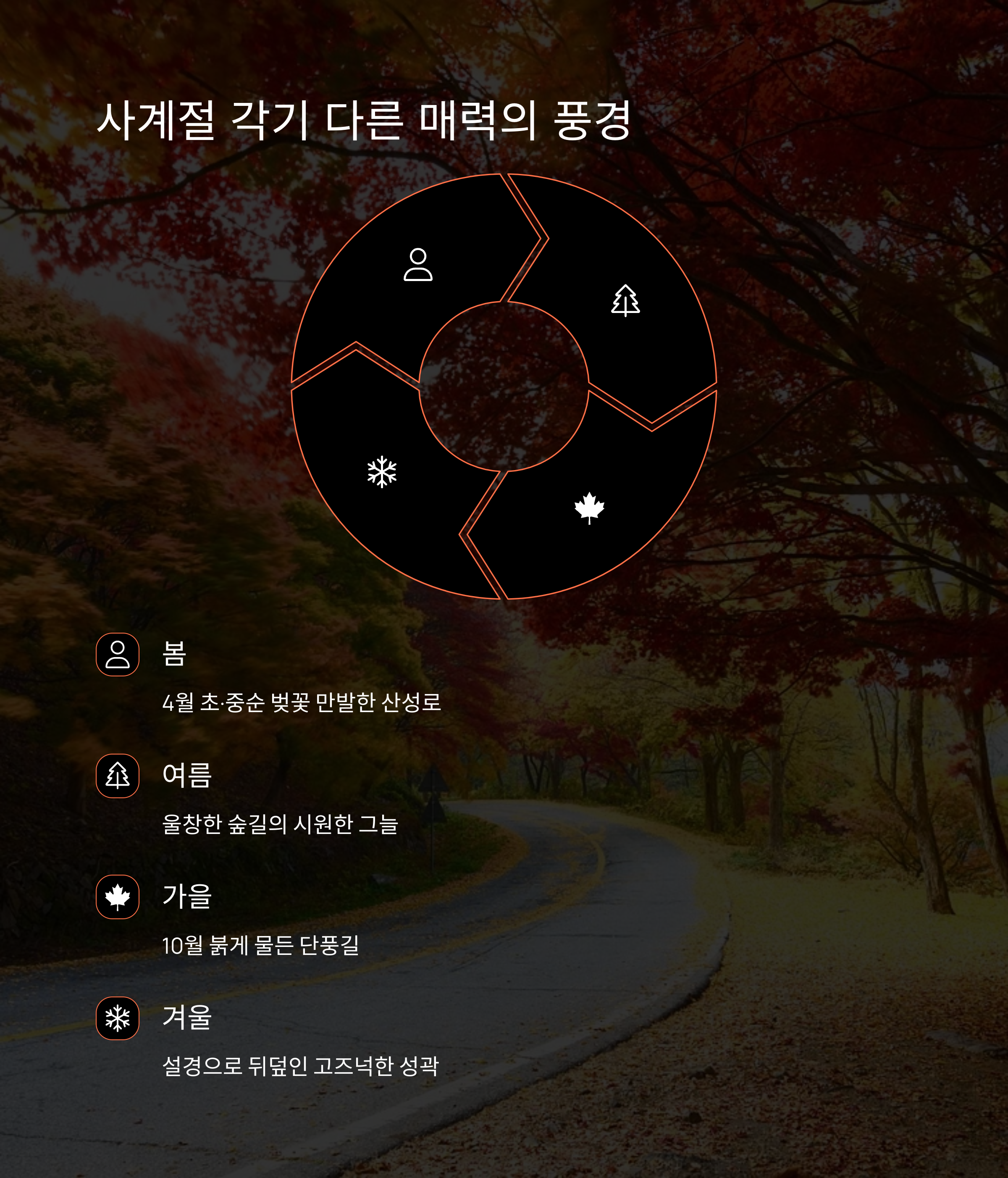 | 사계절 경관 명소 | 봄 벚꽃부터 가을 단풍까지 계절마다 감동적인 풍경 |