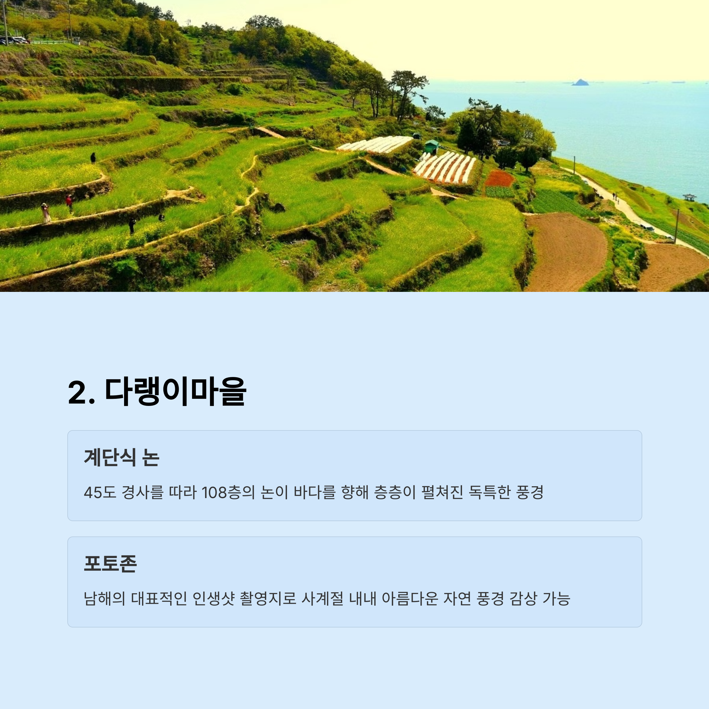 | 금산 보리암, 일출 감상 명소 | 다랭이마을 계단식 논 풍경 | 편백숲 산림욕, 힐링 산책지 |