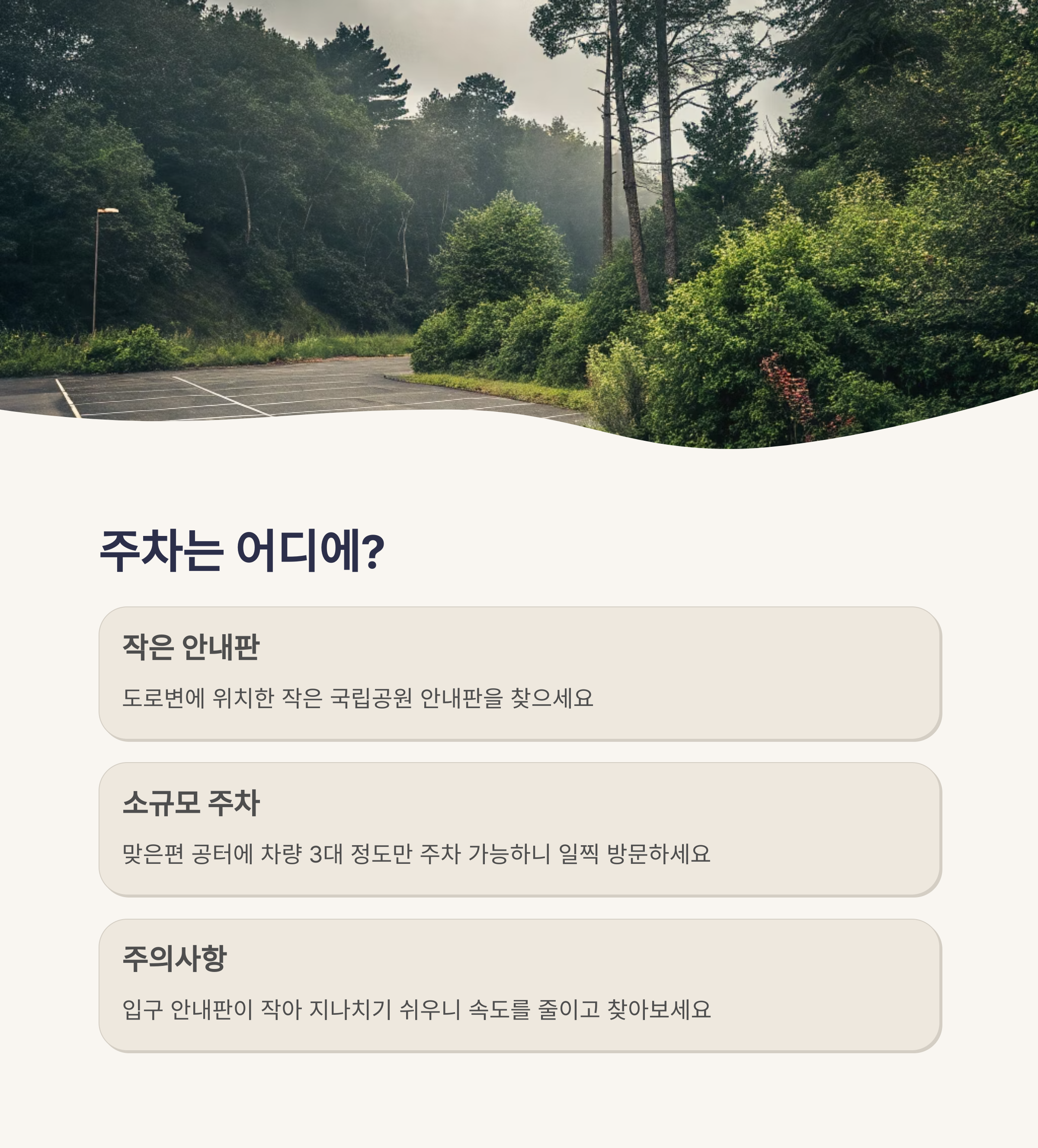 차량으로는 전북 남원 주천면 고기리를 네비게이션에 검색 후, 정령치 고개를 넘어 약 20~30분 남원 방면으로 이동하면 입구 근처에 도착할 수 있습니다. 입구 표식이 작아 네비게이션 활용은 필수이며, 맞은편 공터에는 차량 3대 정도 주차 가능합니다.