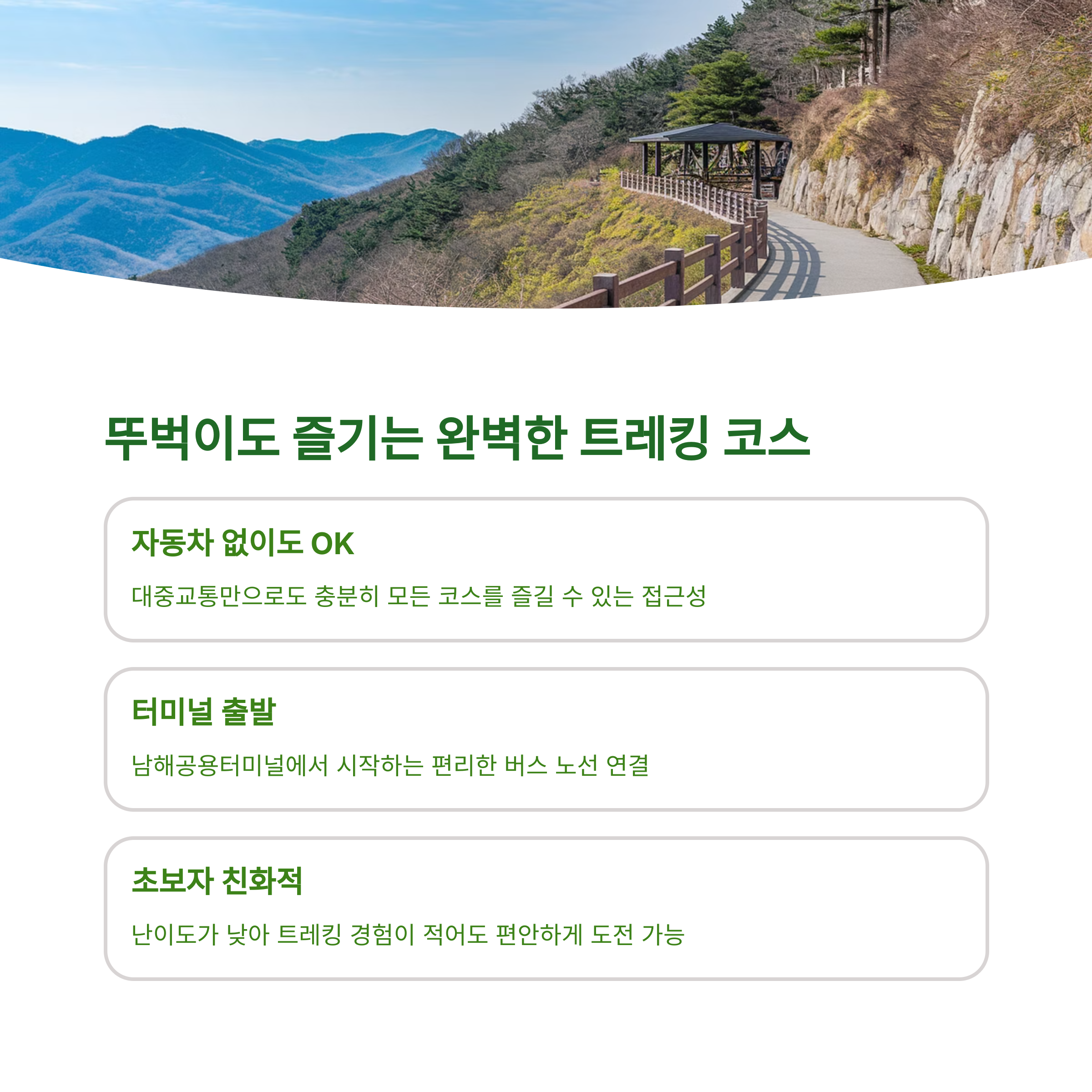 사계절 풍경이 아름다운 길 | 중간중간 쉼터와 벤치 구비 | 초보자도 즐기기 좋은 트레킹 코스 |