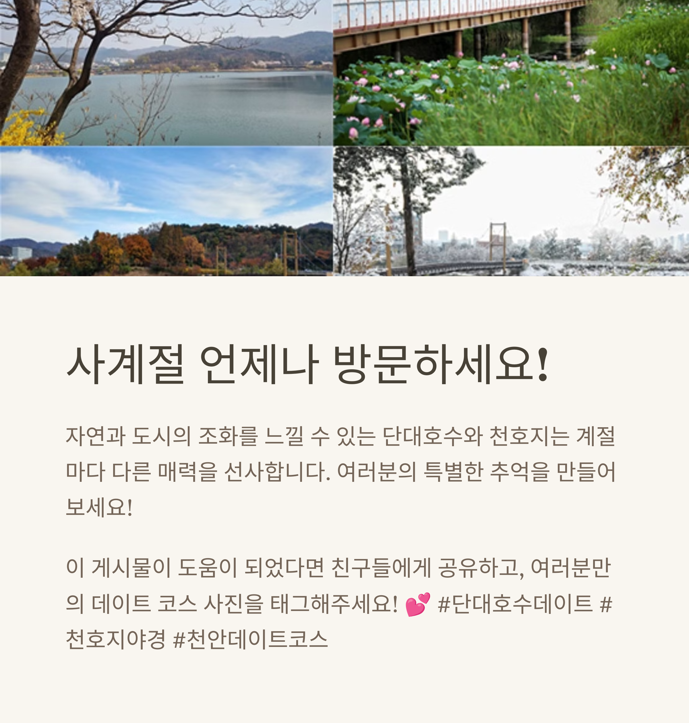 이 두 장소를 더욱 가치 있게 만드는 건 바로 접근성과 분위기입니다. 대중교통으로도 접근이 가능하고, 차량 이용 시에도 주차 공간이 충분하여 스트레스 없이 방문할 수 있습니다. 무엇보다도 계절마다 다른 매력을 품고 있다는 점에서, 단발성 데이트가 아닌 사계절 내내 자주 찾고 싶은 코스로 손색이 없습니다. 단대호수에서는 여유로운 산책을, 천호지에서는 감성적인 드라이브를 함께 즐겨보세요.
