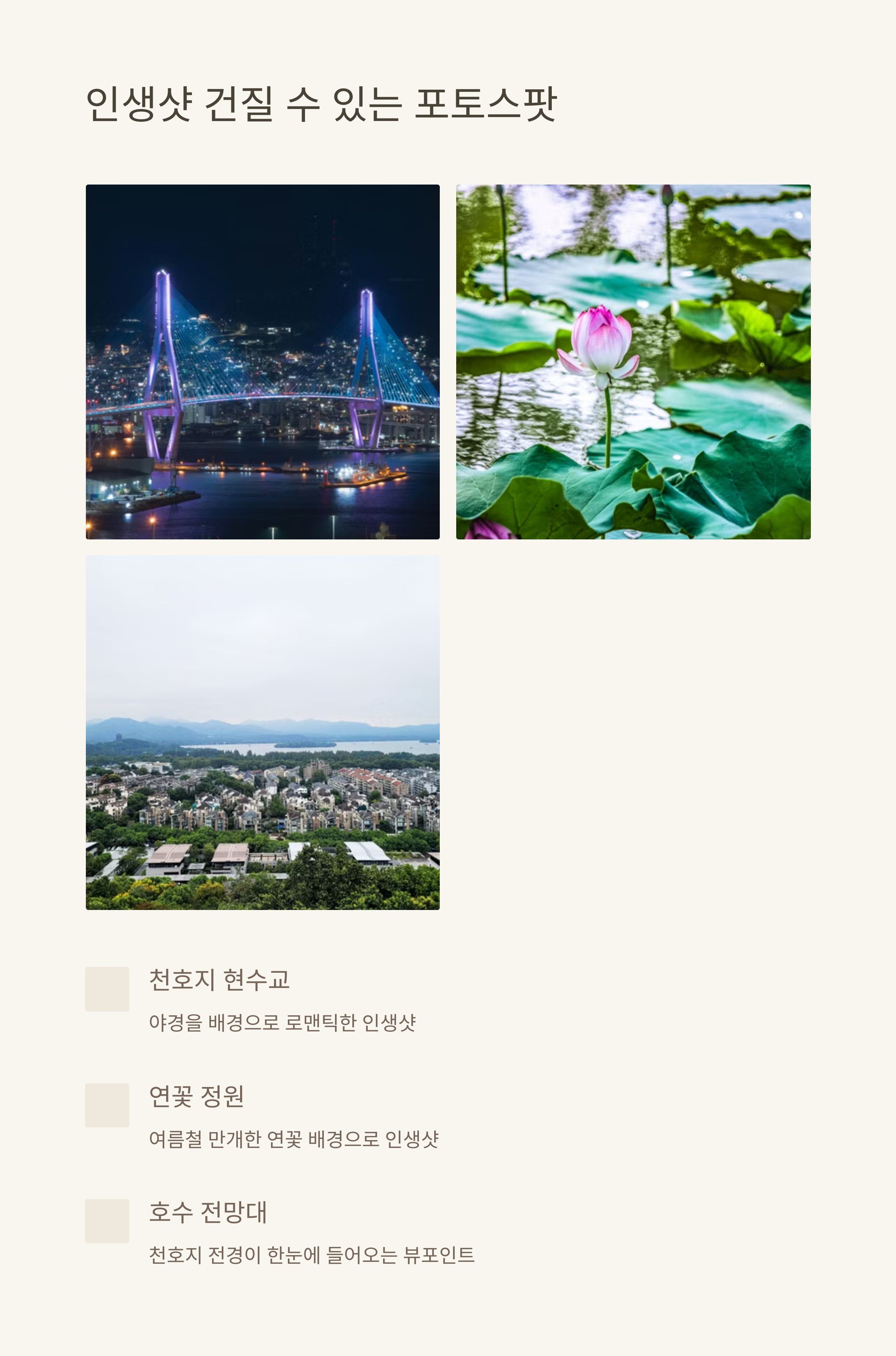 저녁이 되면 천호지의 매력은 더욱 빛을 발합니다. 어둠 속에서 조명이 하나둘 켜지기 시작하면, 호수를 둘러싼 산책로는 마치 영화 속 한 장면처럼 낭만적인 분위기로 변합니다. 특히 차량을 이용한 드라이브 코스로도 매우 추천할 만한데요. 넓은 공영주차장이 가까이에 있어 주차 걱정도 없고, 차량 안에서 조용히 음악을 틀며 커피 한 잔을 나누는 것만으로도 충분히 특별한 시간을 보낼 수 있습니다. 연인뿐 아니라 가족, 친구끼리도 알찬 시간을 보내기 좋아 야경 명소로 손꼽히는 이유가 여기에 있습니다.
