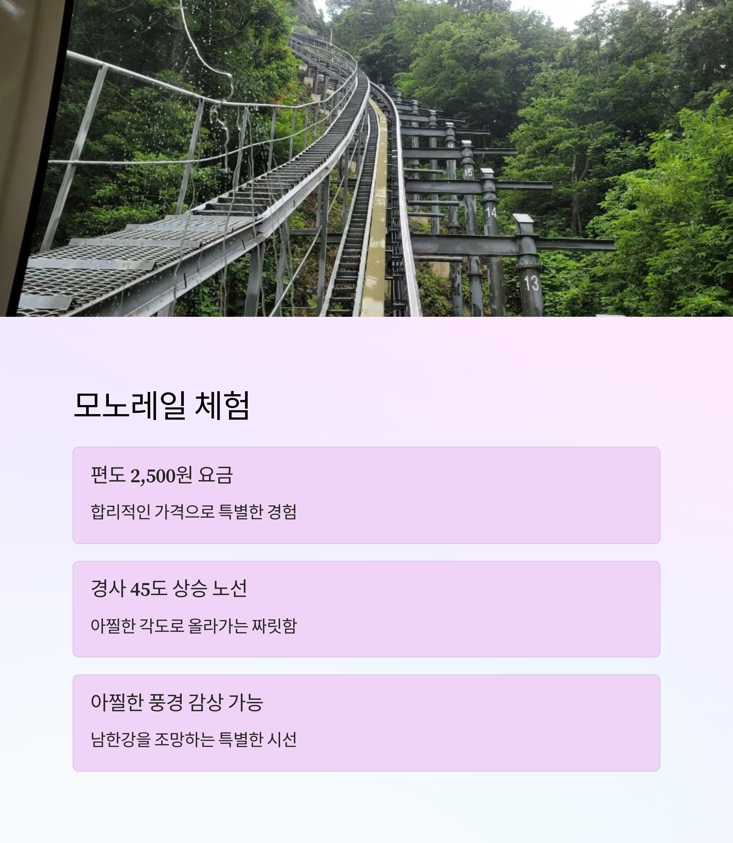 | 모노레일 | 유료 운영, 편도 2,500원, 전망대 상부까지 이동 가능 |
