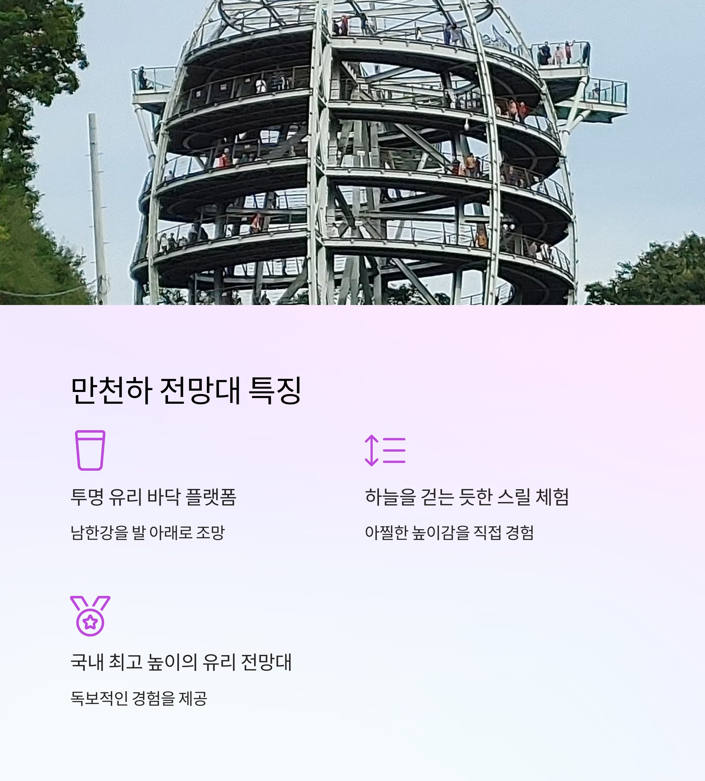 | 남한강 조망, 유리 바닥 전망 플랫폼 | 무료 운영, 주차장~전망대 연결 | 편도 2,500원, 상부까지 편안하게 이동 |