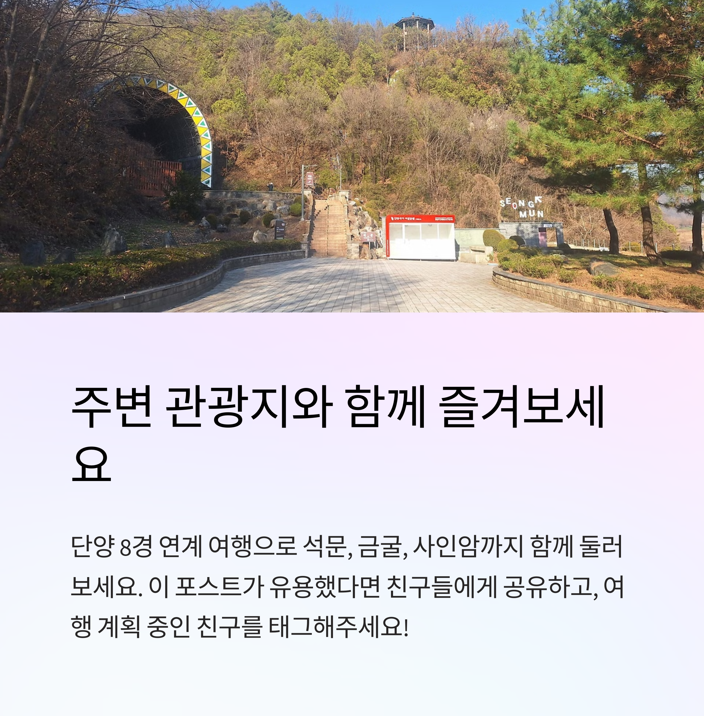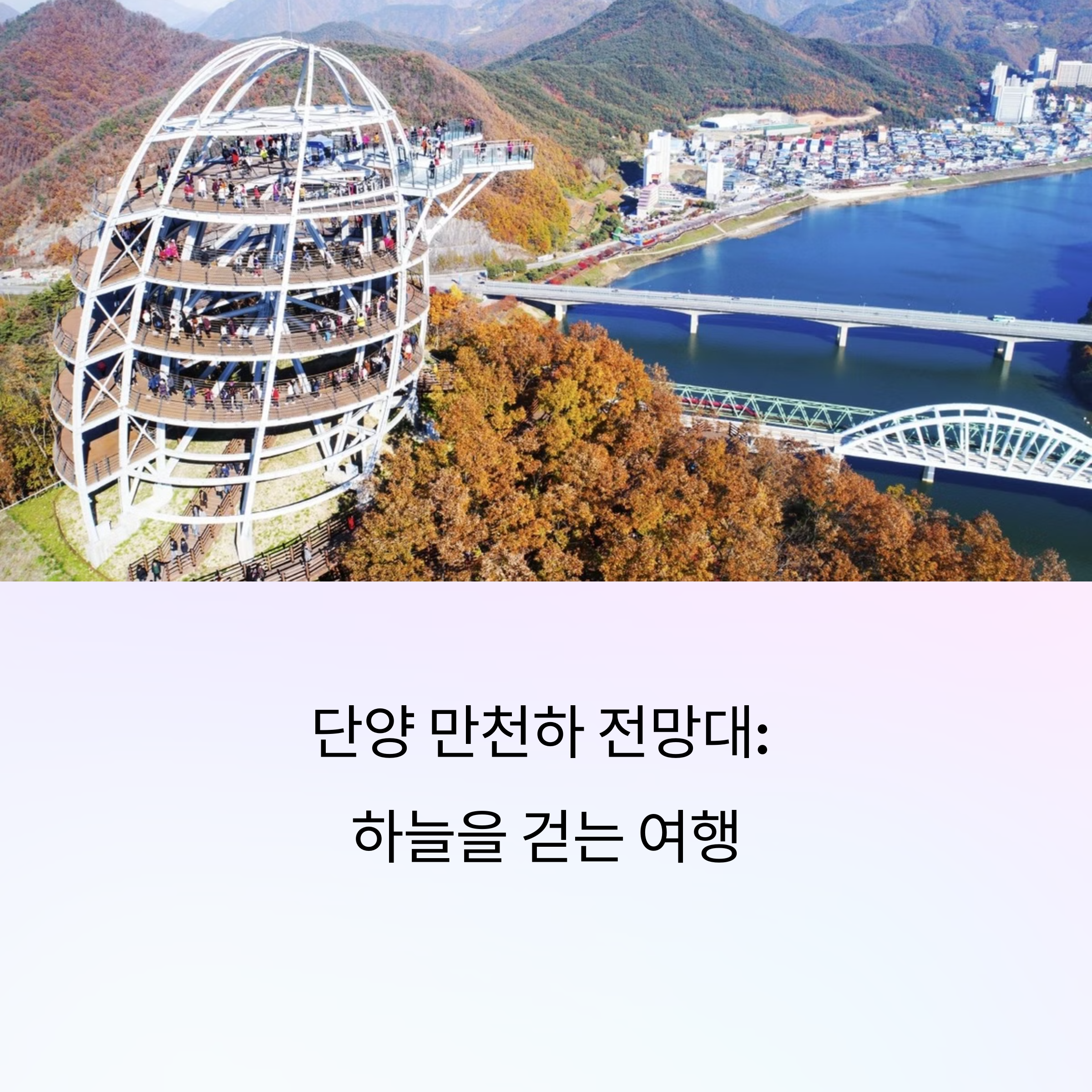만천하 전망대는 유리바닥 플랫폼과 곡선형 스카이워크로 유명하며, 사진 명소로도 손꼽히는 곳입니다. 계절마다 풍경이 바뀌며, 특히 가을철 단풍 시즌에는 산 전체가 붉게 물들어 더욱 아름다운 경관을 제공합니다. 체력 부담 없이 쉽게 오를 수 있고, 셔틀과 모노레일을 조합해 효율적인 여행 동선을 짤 수 있어 단양 여행 초보자에게도 최적의 장소입니다.