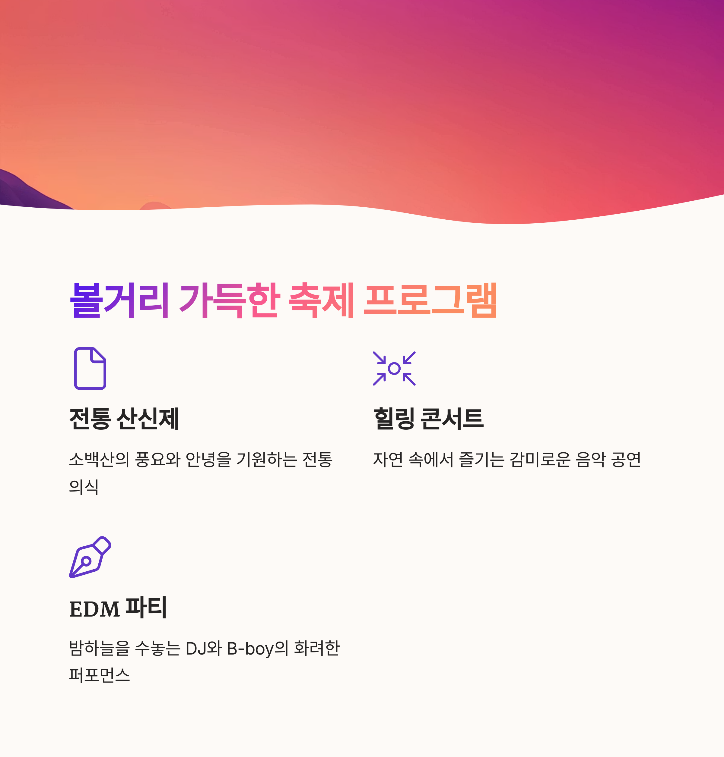 단양 소백산 철쭉제는 단순한 꽃 축제를 넘어 등산과 문화행사가 결합된 체험형 봄축제입니다. 매년 5월 말~6월 초까지 연분홍 철쭉이 능선을 가득 채우며 비로봉, 연화봉, 국망봉 정상에서 내려다보는 풍경은 사진보다 훨씬 더 감동적인 장관을 선사합니다. 축제 기간에는 단양읍에서 다양한 먹거리, 공연, 체험 부스도 마련되며 전국노래자랑과 EDM 파티 등 세대 불문 즐길 수 있는 프로그램도 눈길을 끕니다.