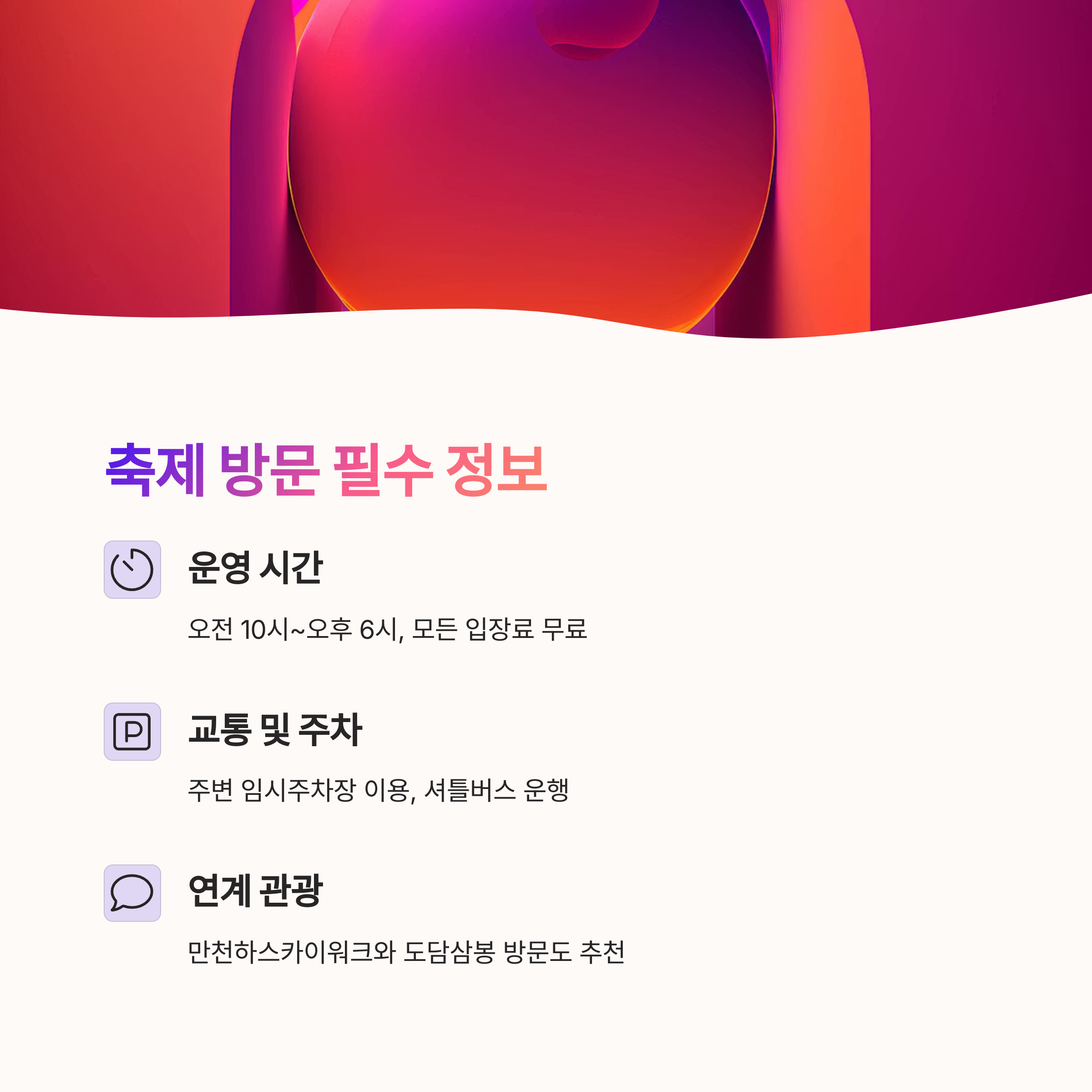 단양 소백산 철쭉제는 봄철 꽃 구경, 산행, 축제 분위기를 한꺼번에 즐길 수 있는 전국 유일의 종합 봄여행 코스입니다. 산정상에서 마주하는 철쭉 군락의 장관과 단양 시내의 다양한 문화행사는 일상에 지친 몸과 마음을 동시에 치유해주는 힘이 있습니다. 특히 등산을 즐기지 않더라도 천동이나 비로사 코스를 통해 가볍게 철쭉길을 걷는 것만으로도 충분한 감동을 느낄 수 있습니다.