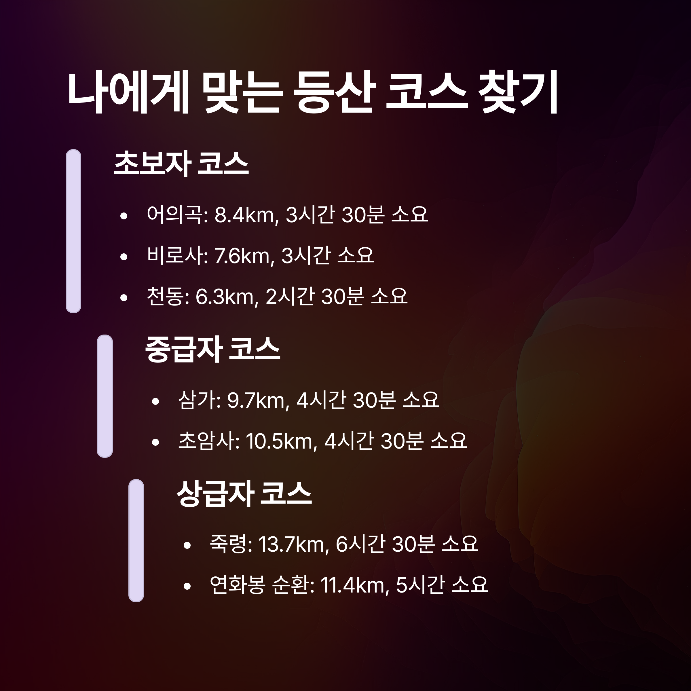 | 추천 등산코스 | 초보자부터 상급자까지 맞춤형 트레킹 루트 안내 |