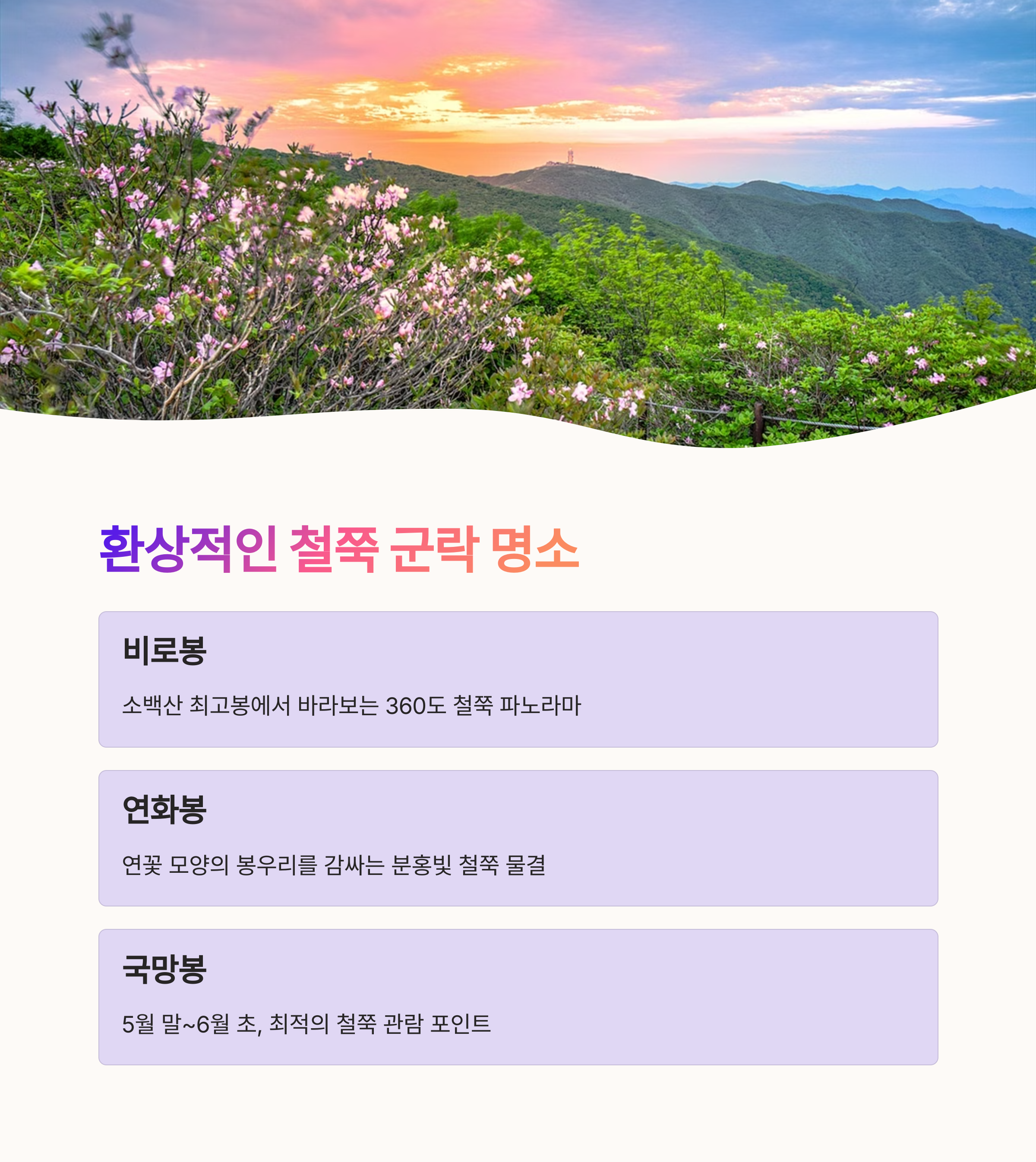 소백산 철쭉제를 다녀오신 분들의 추천 코스나 감동적인 풍경 이야기를 댓글로 남겨주세요. 처음 가는 분들에게 많은 도움이 됩니다!