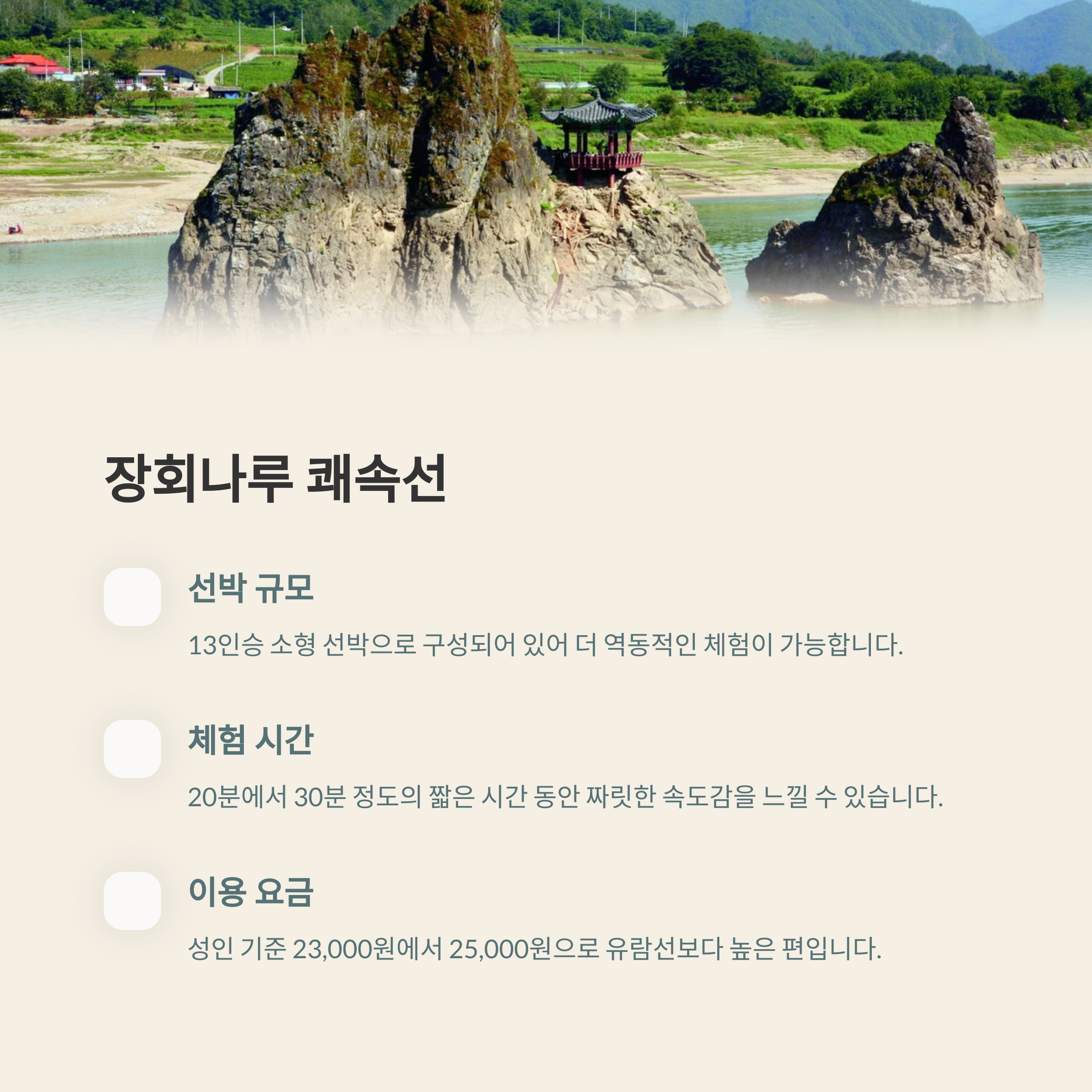쾌속선 체험 | 같은 구간을 더 빠르고 역동적으로 즐길 수 있는 액티비티입니다. |