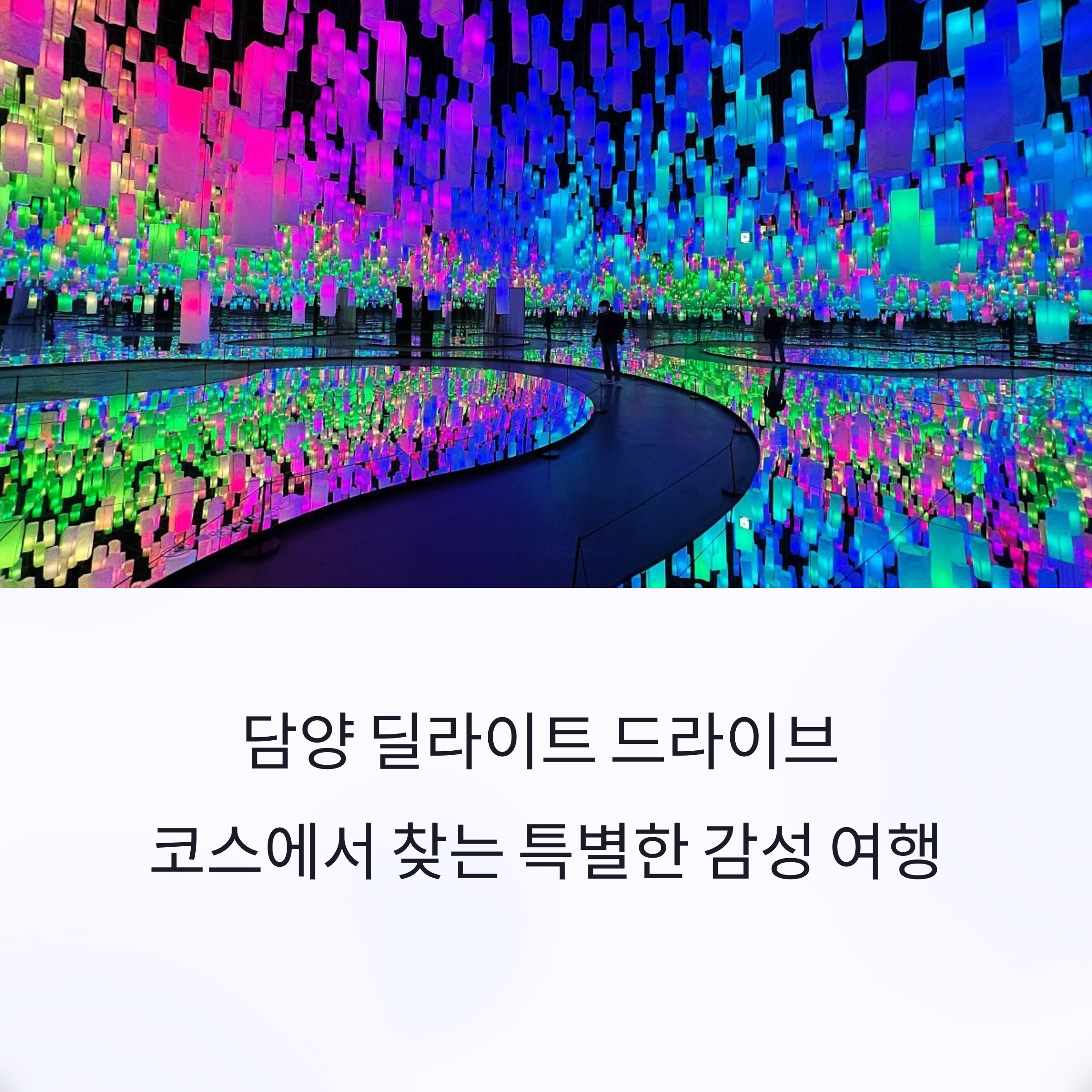예술과 자연을 동시에 즐기고 싶은 분들에게 담양 딜라이트 드라이브 코스는 최적의 선택입니다. 실내 미디어 전시로 날씨에 구애받지 않으며, 근처에 위치한 다양한 자연 명소들과의 연계도 훌륭해 하루 여행 코스로 손색이 없습니다. 감성적인 전시 관람과 힐링 산책, 드라이브까지 모두 한 번에 즐길 수 있어, 연인, 가족, 친구들과의 여행지로 적극 추천드립니다. 전라남도의 색다른 매력을 만나고 싶다면, 지금 바로 담양으로 떠나보세요.