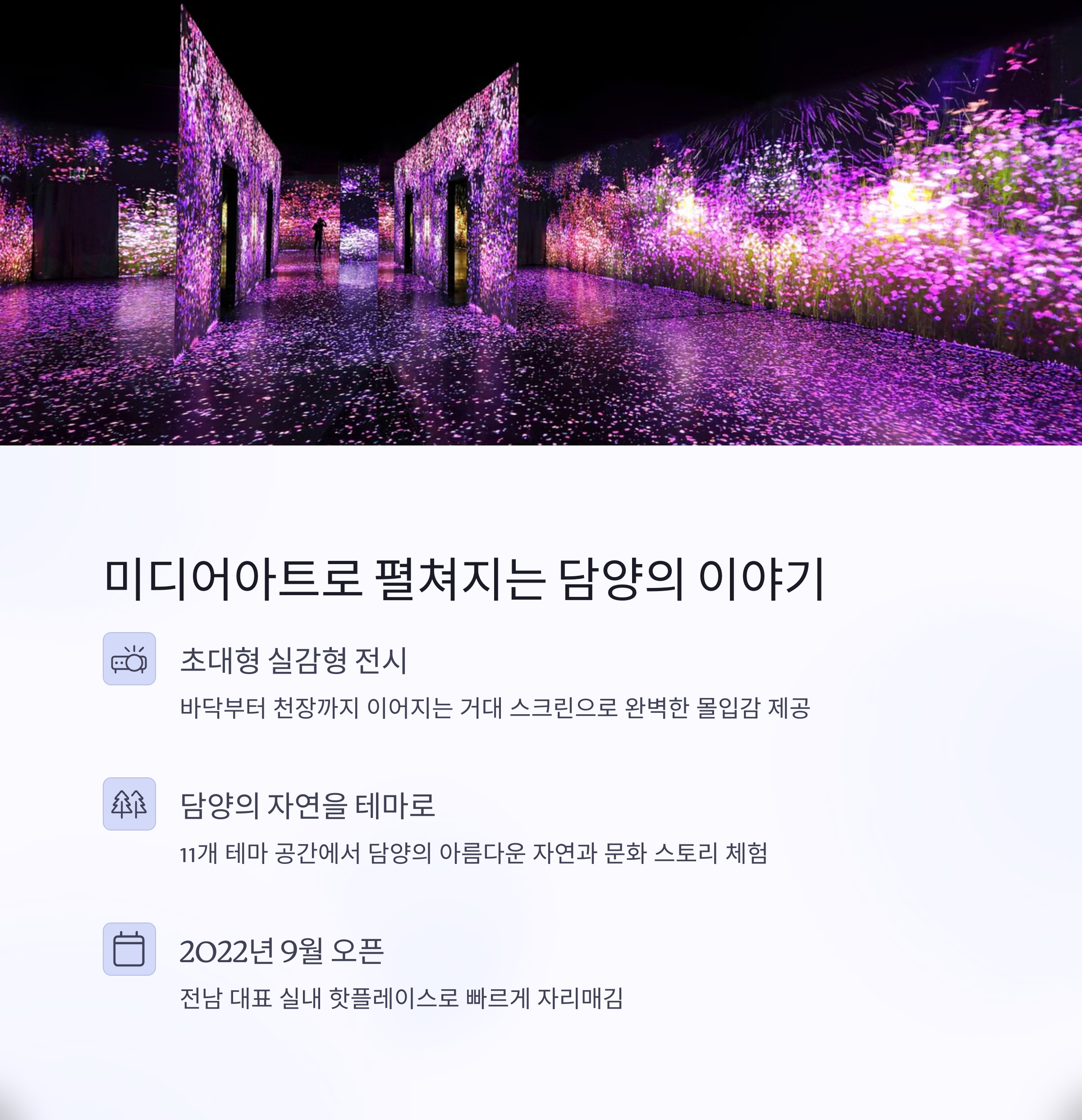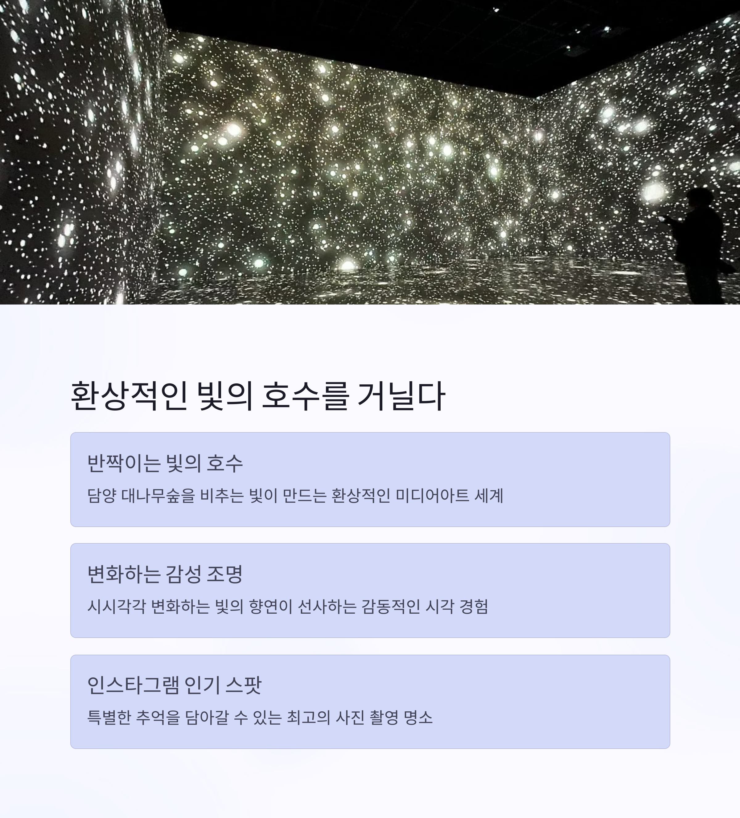 | 사계절 내내 감동을 주는 미디어아트 전시 | 연인, 가족 모두에게 인기 있는 힐링 코스 | 담양의 자연과 문화가 어우러진 여행지 |
