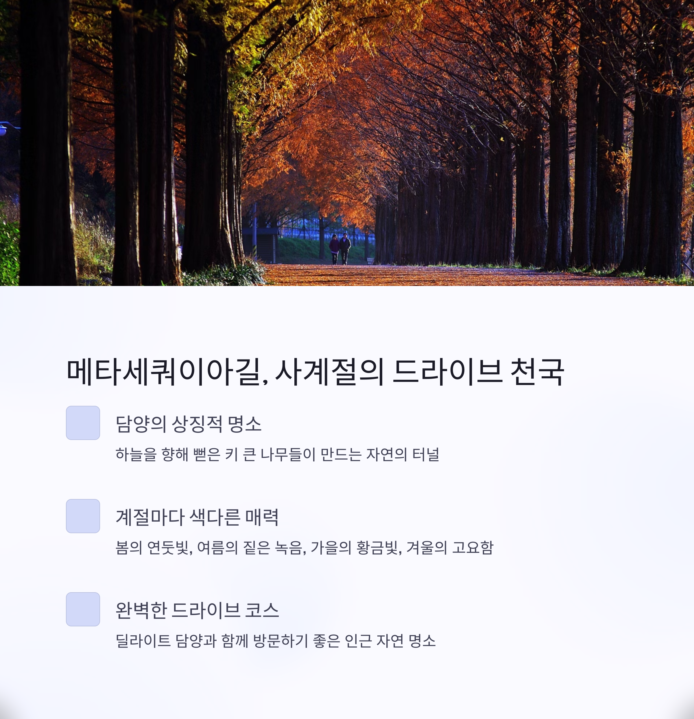 | 감성 드라이브 코스 | 메타세쿼이아길, 죽녹원과 연계한 산책 추천지 |