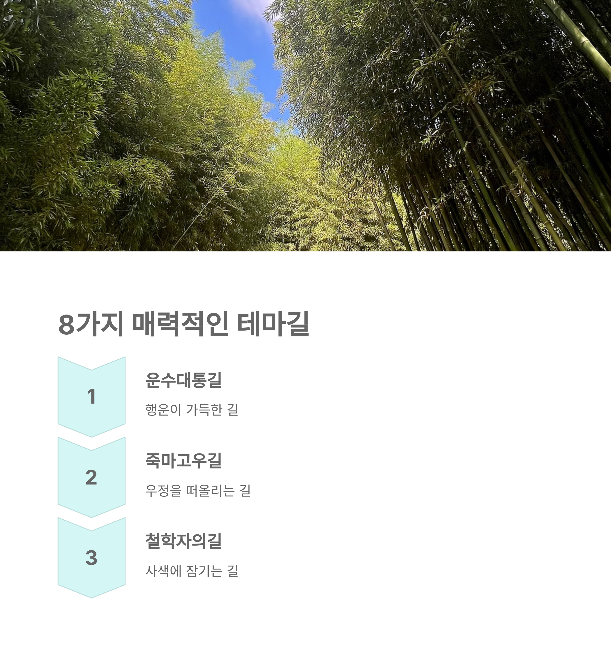 | 2.4km 길이의 테마형 대나무 산책 코스 | 족욕장, 전망대, 사랑길 등 커플을 위한 동선 | 죽녹원과 함께 즐기는 한옥카페·국수거리 |