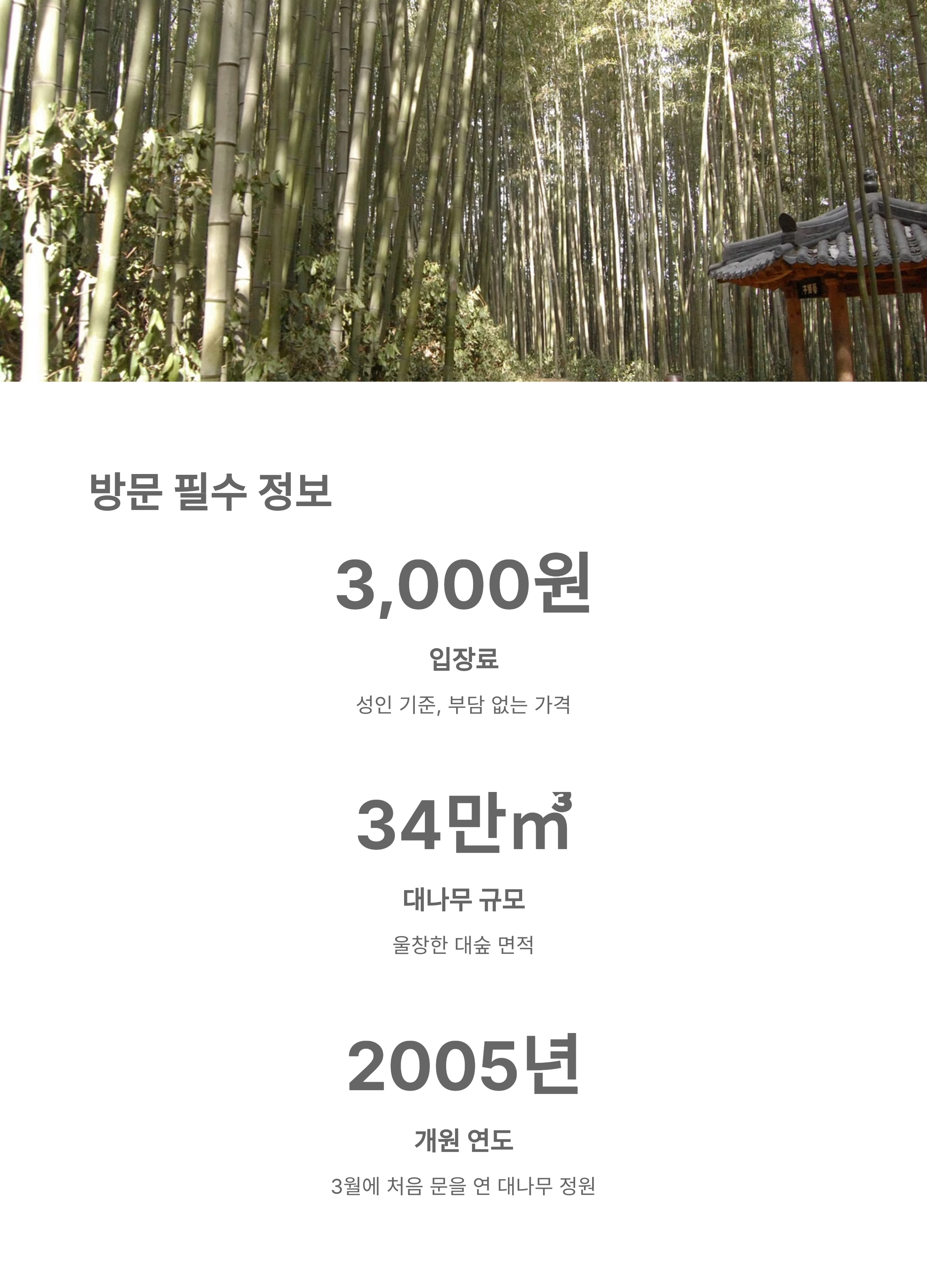 | 대나무 산책길 | 2.4km 테마 산책로로 구성된 전남 대표 녹음길 |