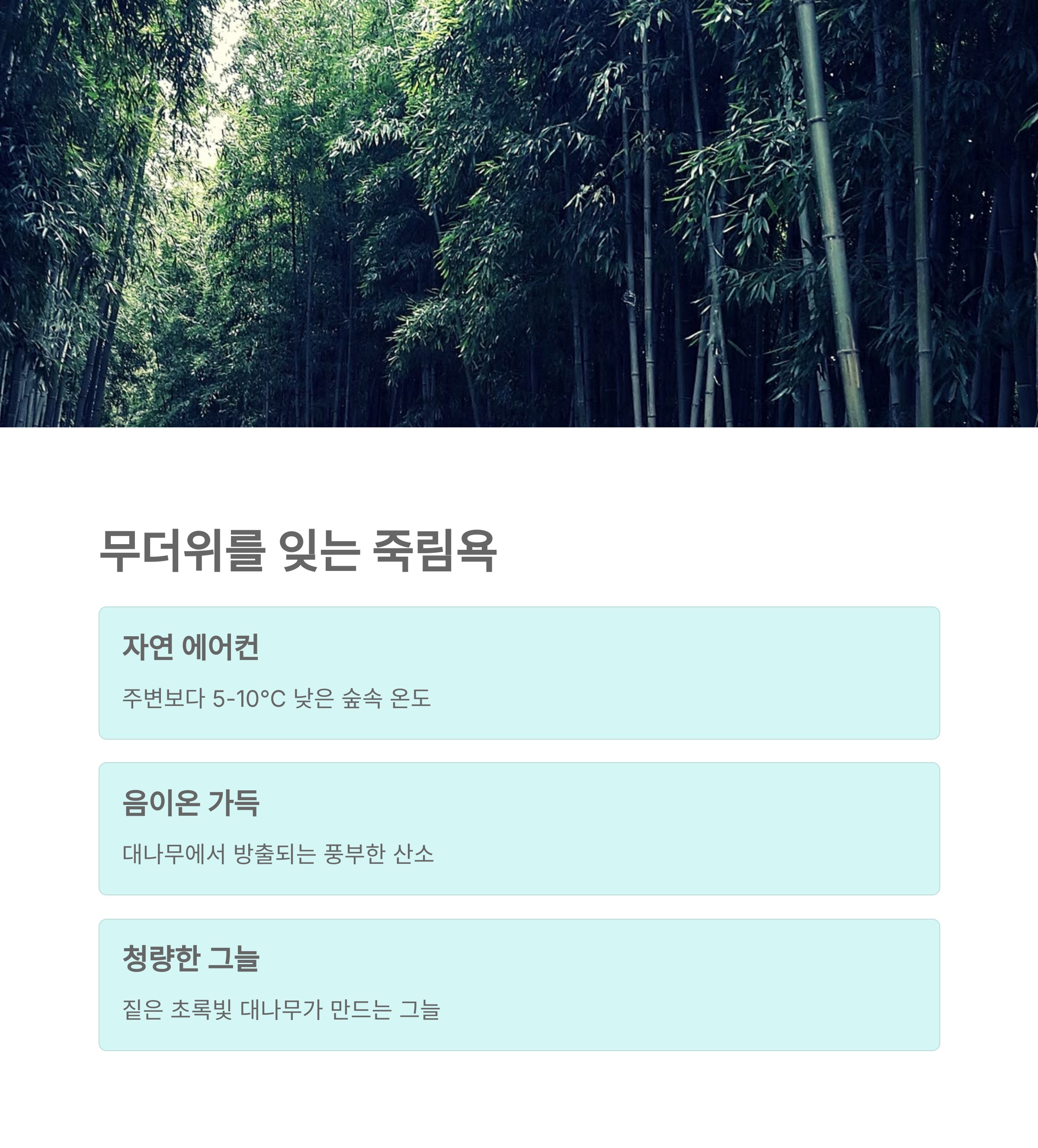 | 자연 속 피톤치드로 스트레스 해소 | 무더운 날씨에도 시원하게 걷는 대숲길 | 전남 대표 힐링 여행지로 인기 높은 산책 장소 |